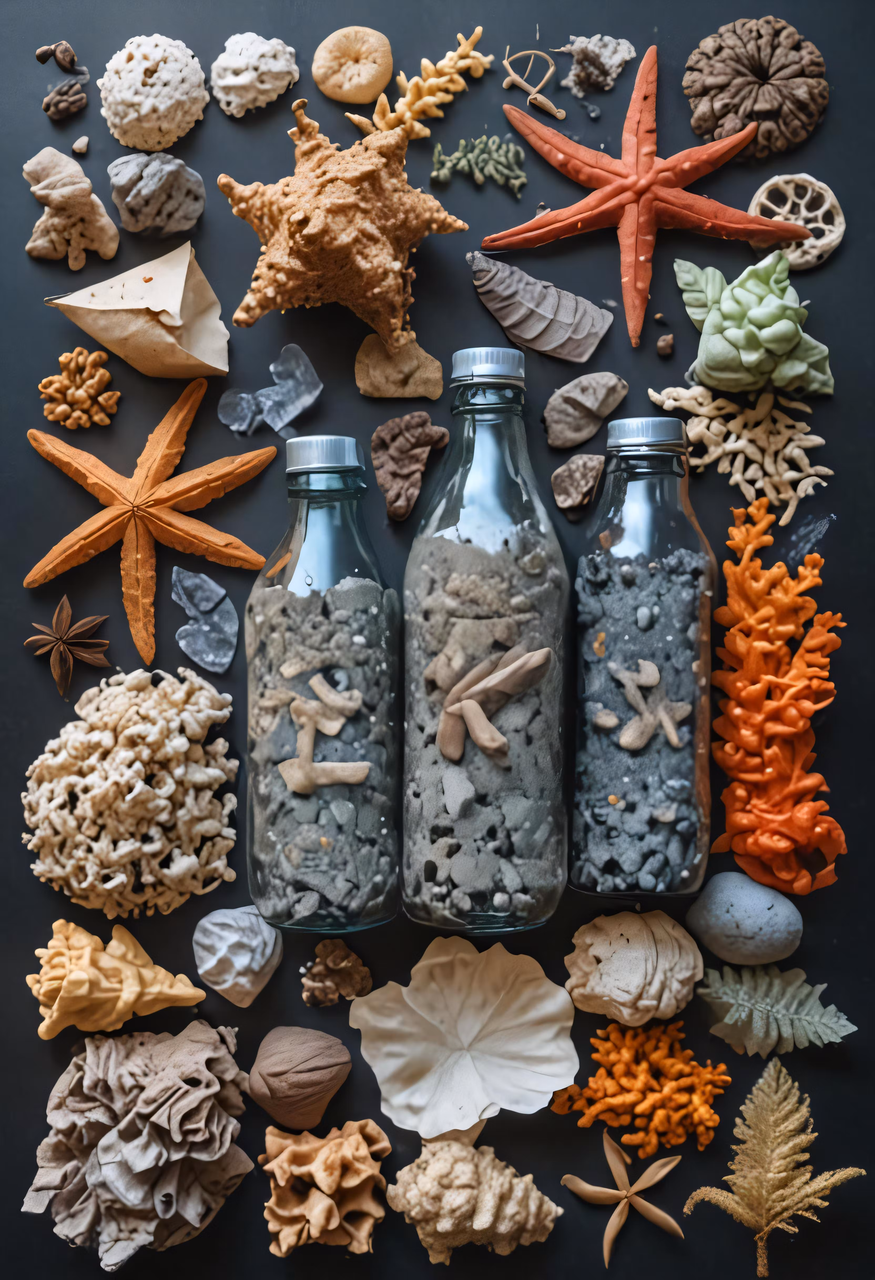 High resolution picture, free to use, different shells and starfish in jars, on a black surface