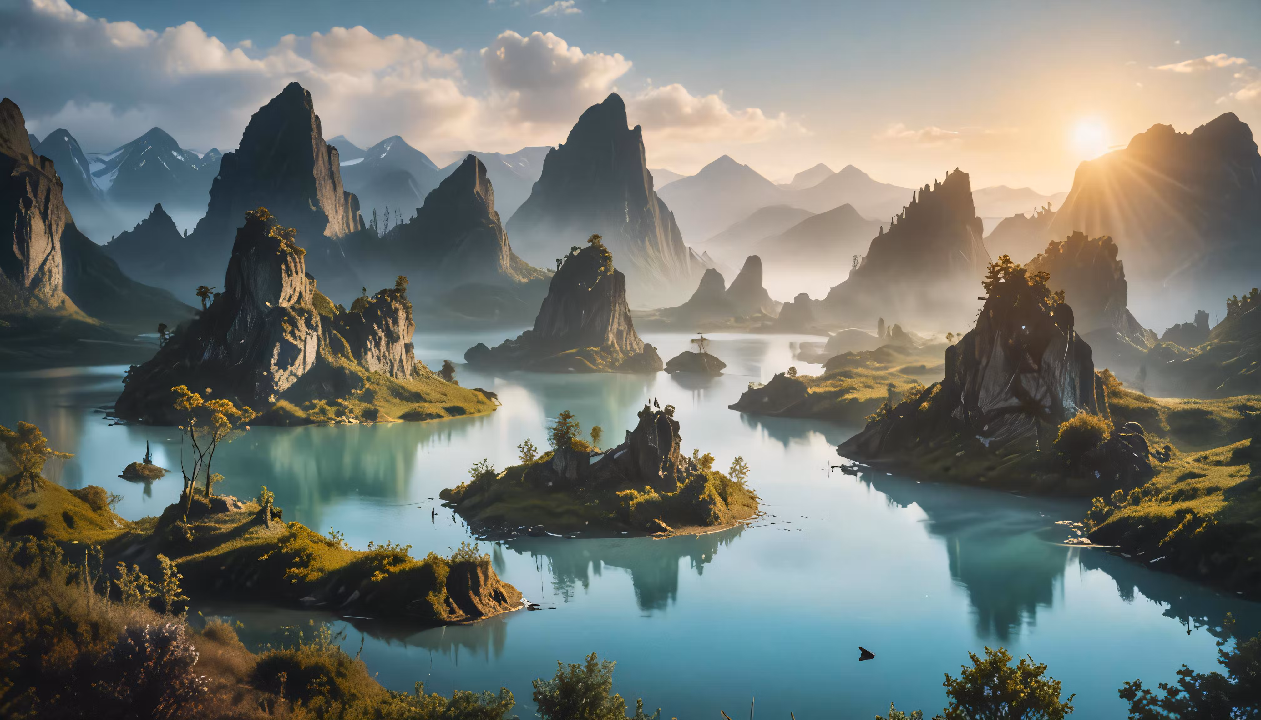 High resolution picture, free to use, digital painting of a small island in a lake surrounded by mountains