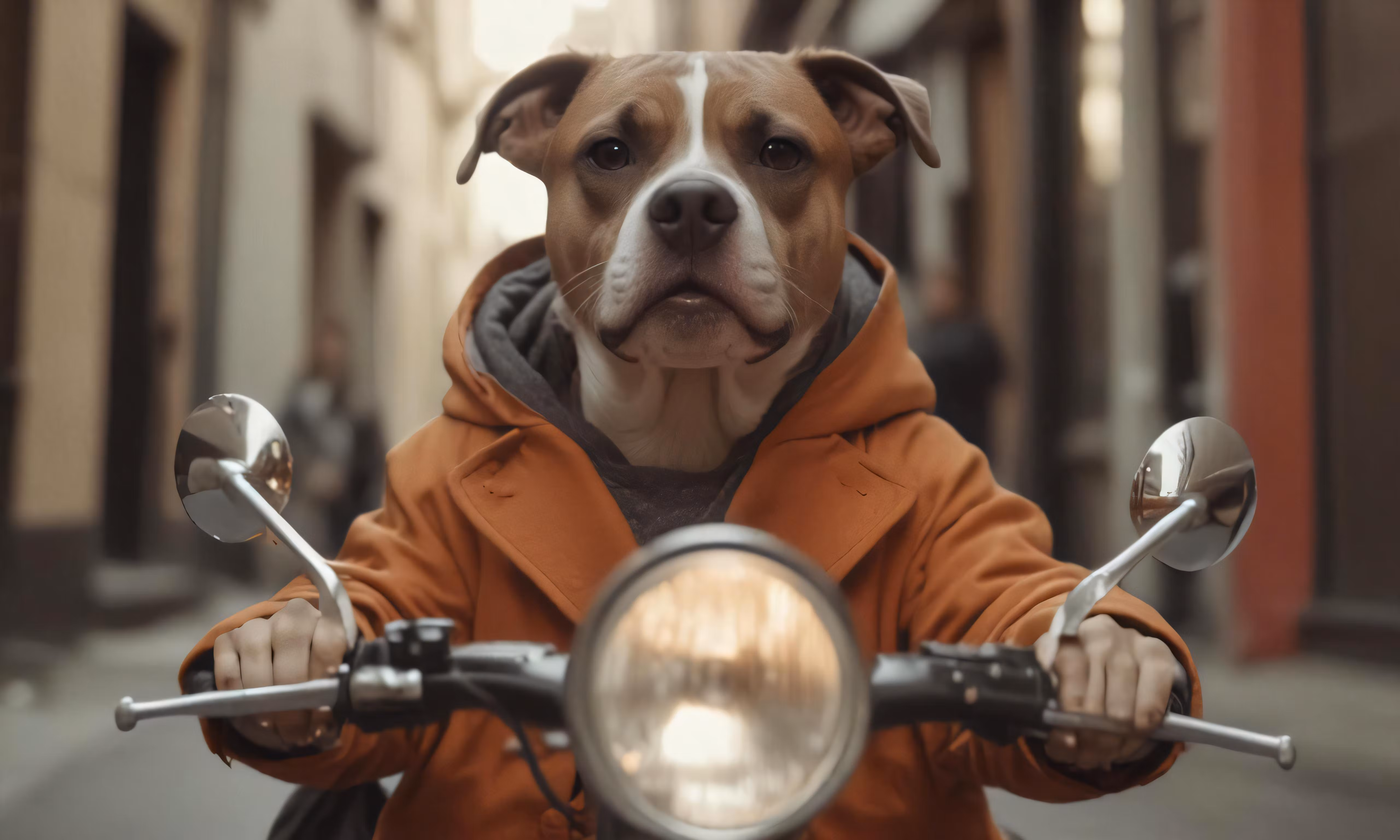 High resolution picture, free to use, dog wearing an orange jacket with its tongue out while on the motorcycle