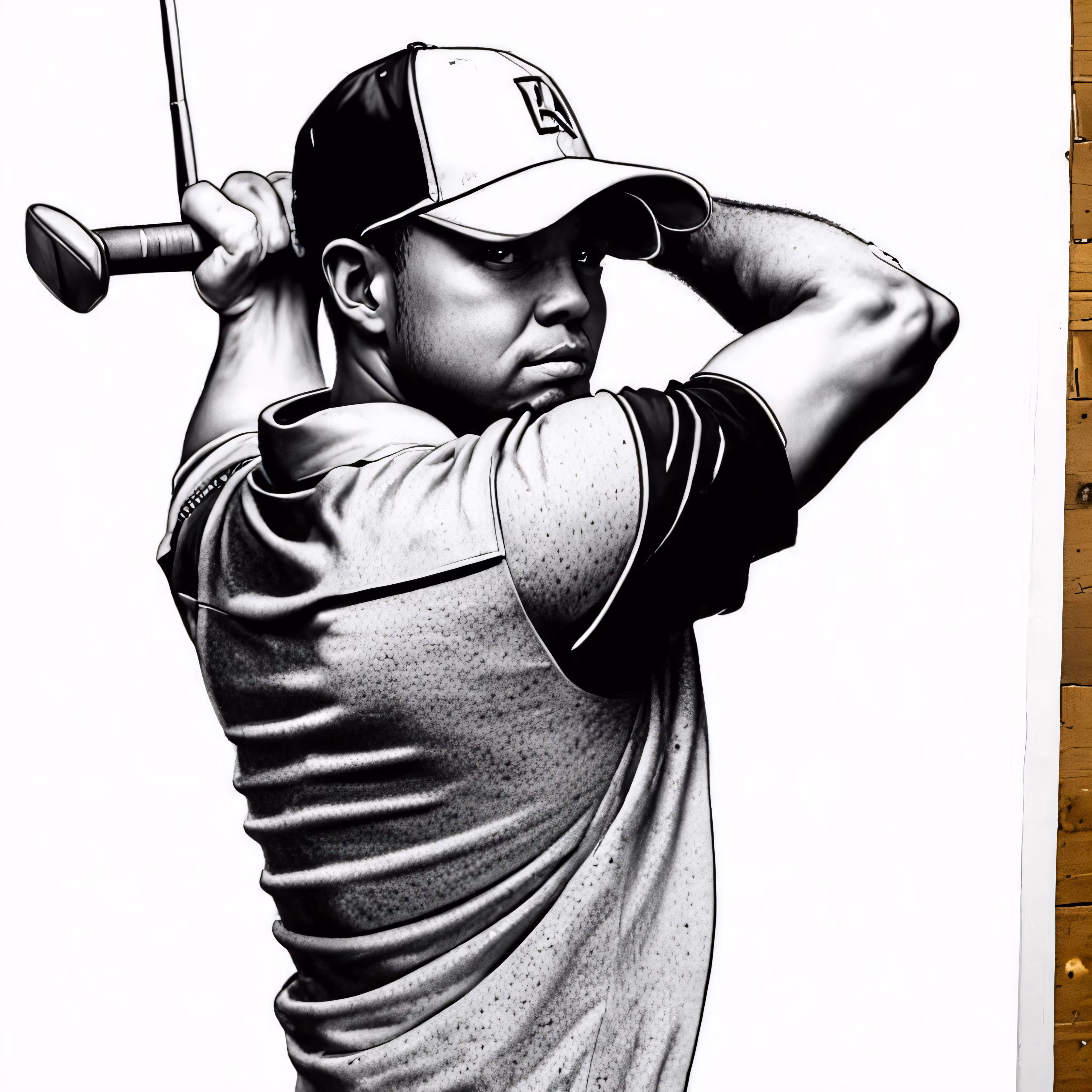 High resolution picture, free to use, drawing of a professional golf player in action, his tee swing in view with a brick wall behind him