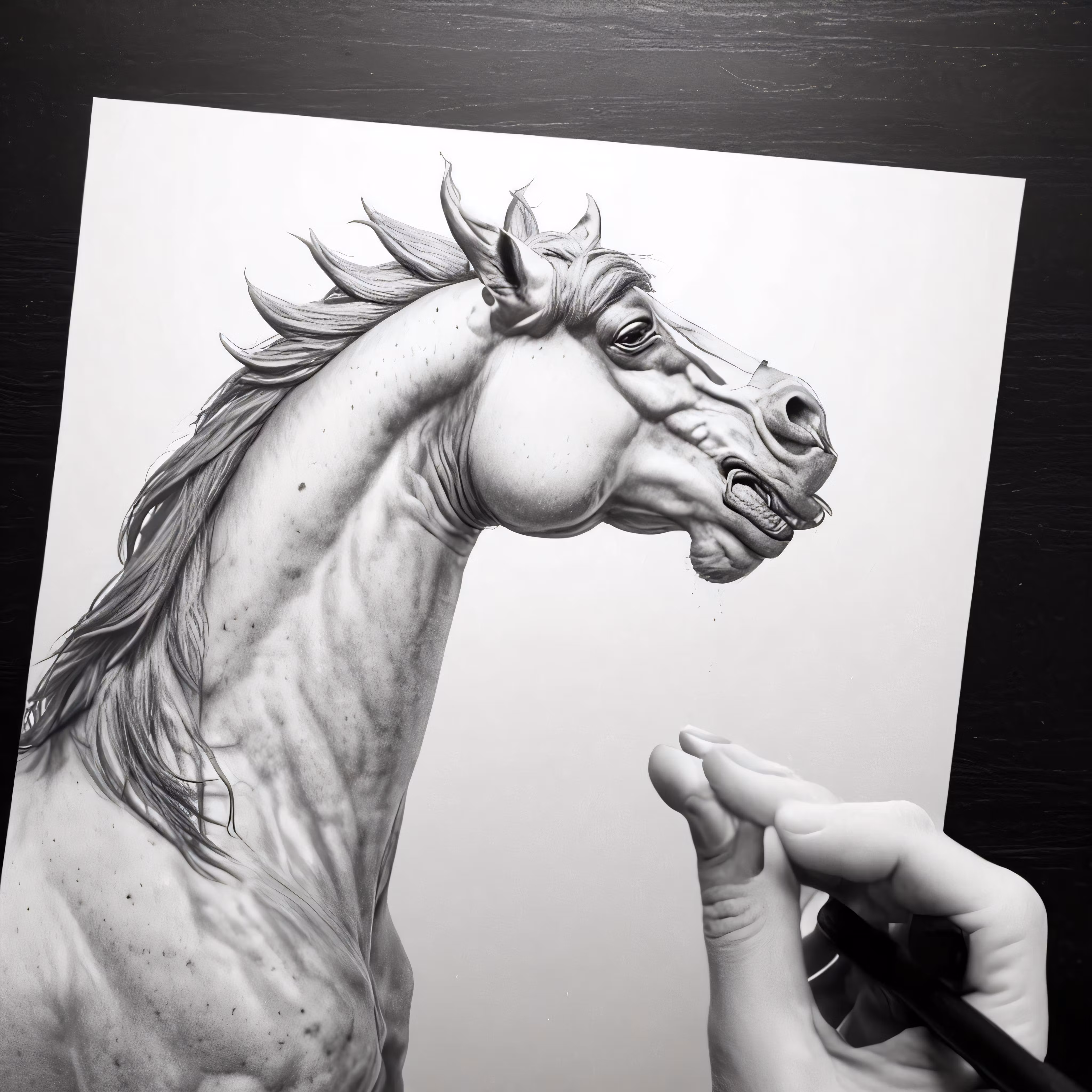 High resolution picture, free to use, drawing the face of a horse using a pen and ink