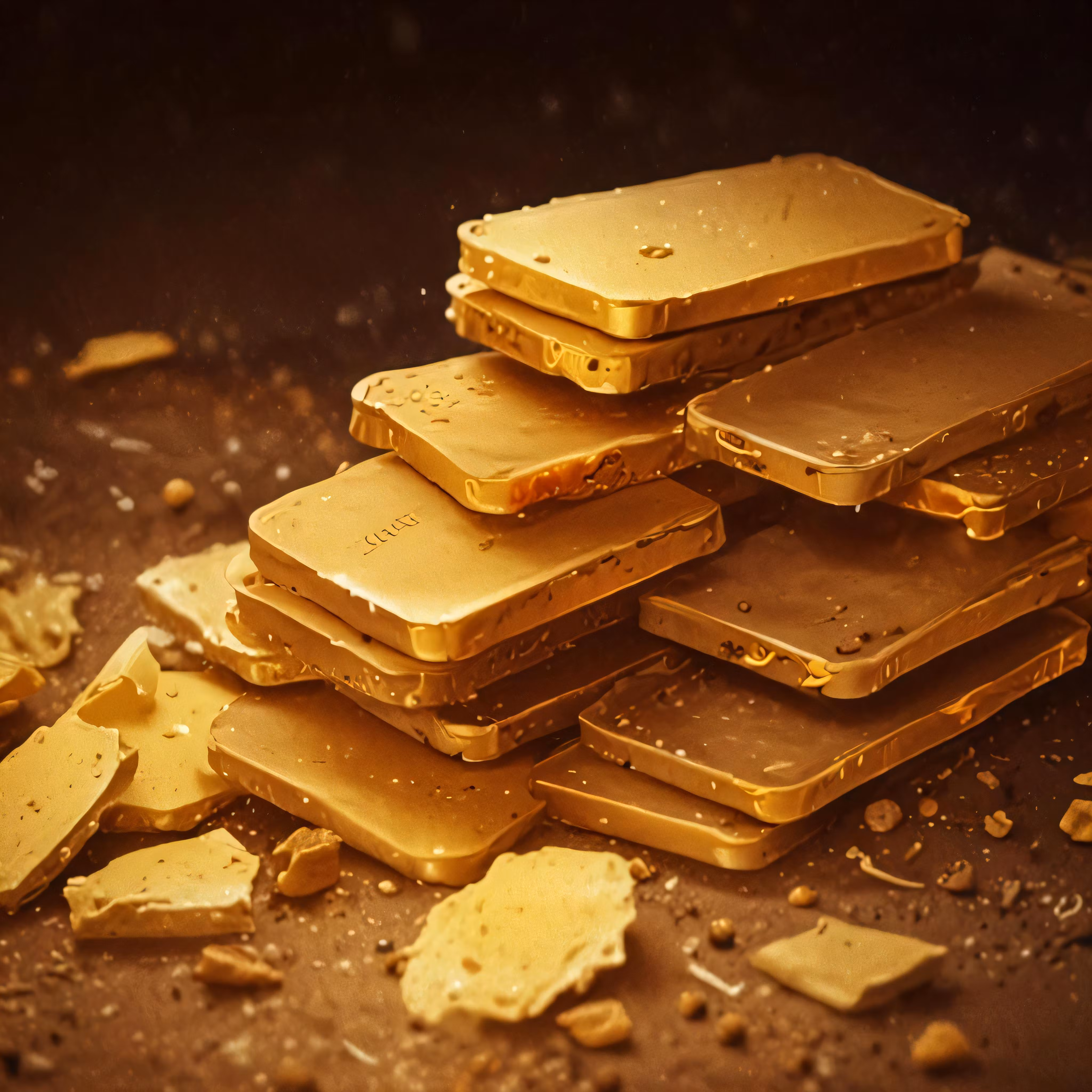 High resolution picture, free to use, five golden bars sit on top of some rocks