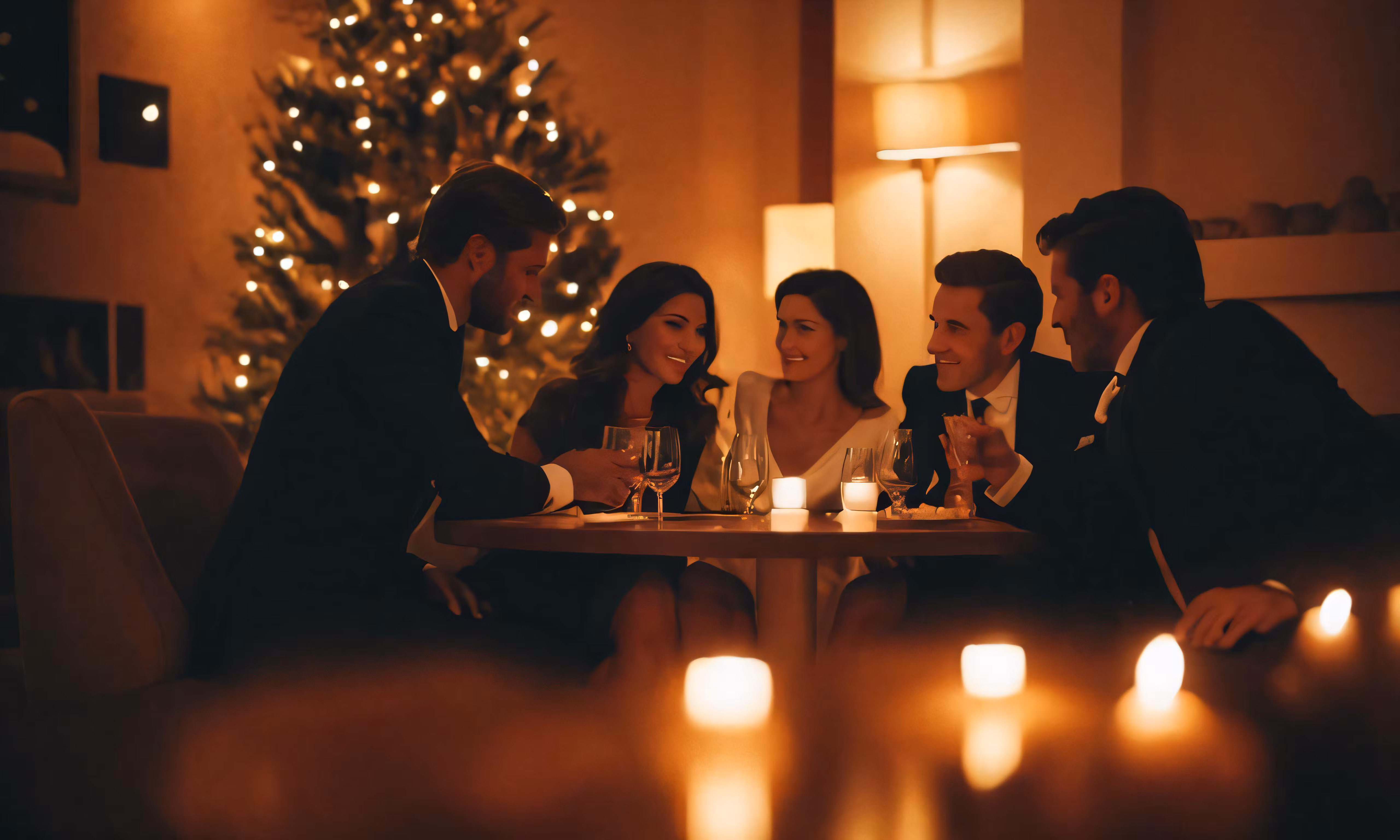 High resolution picture, free to use, five people enjoying food at a restaurant in a holiday decorated area