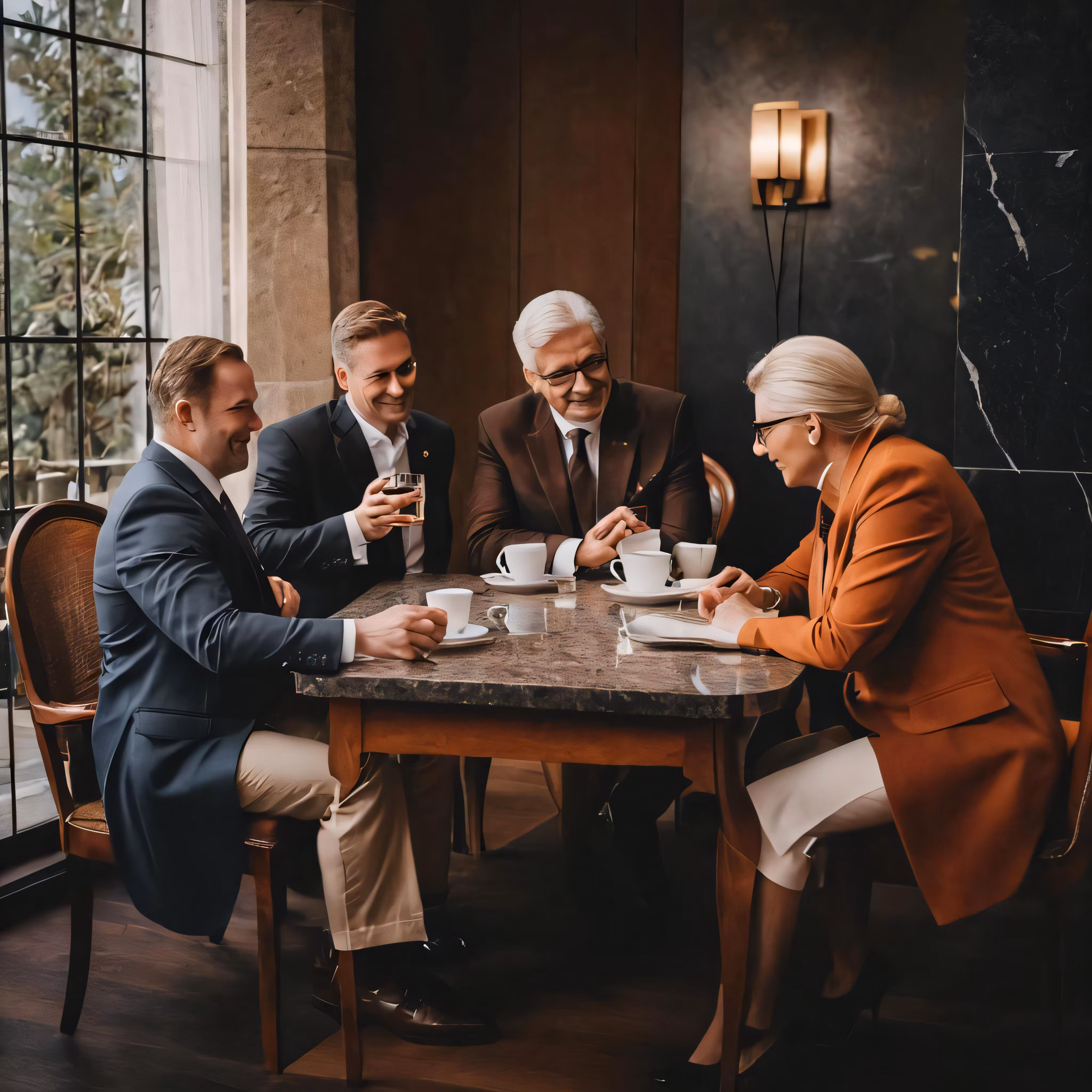 High resolution picture, free to use, five people sitting at a table drinking coffee and having conversation