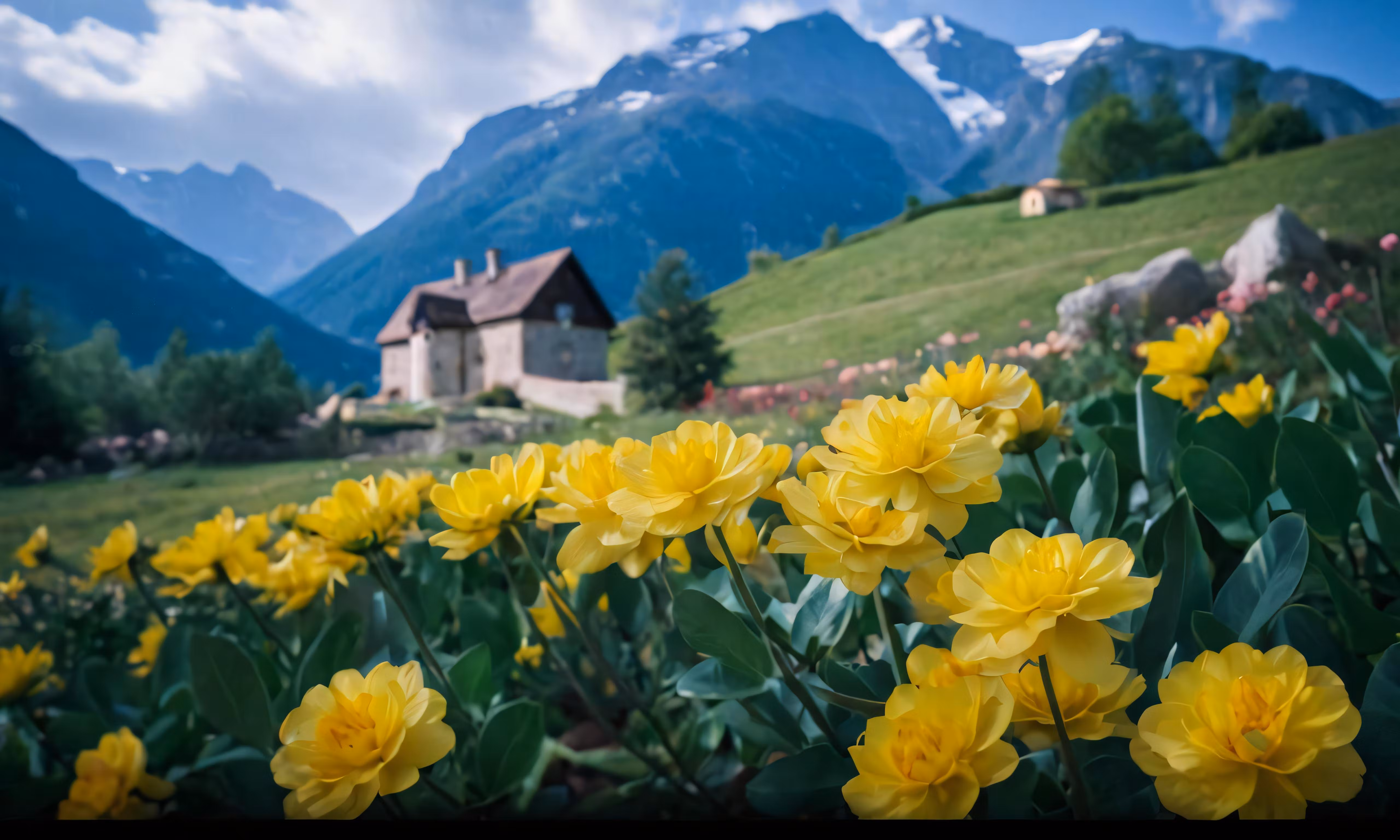 High resolution picture, free to use, flowers blooming on the hillside next to the house