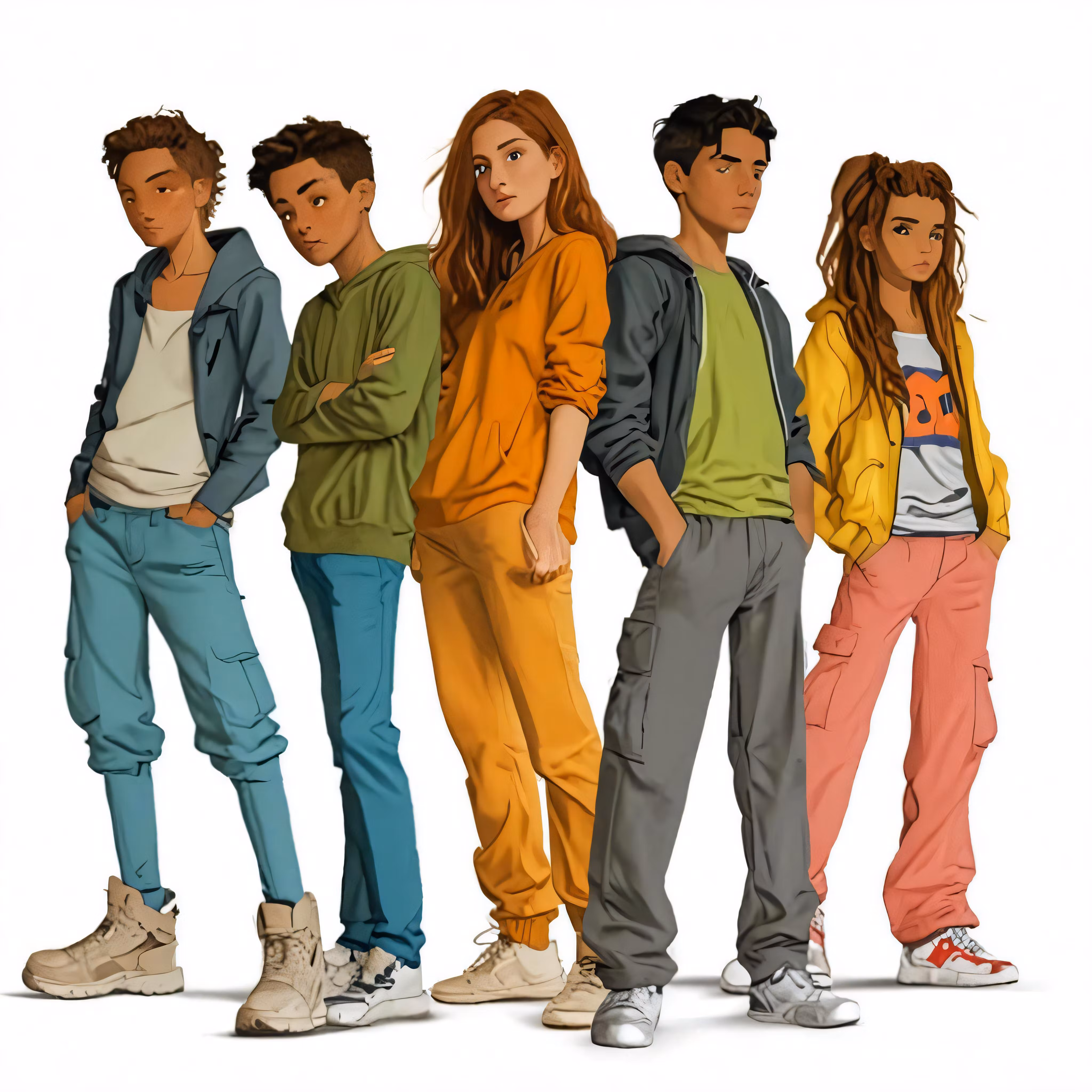 High resolution picture, free to use, four boys and a girl are in different outfits