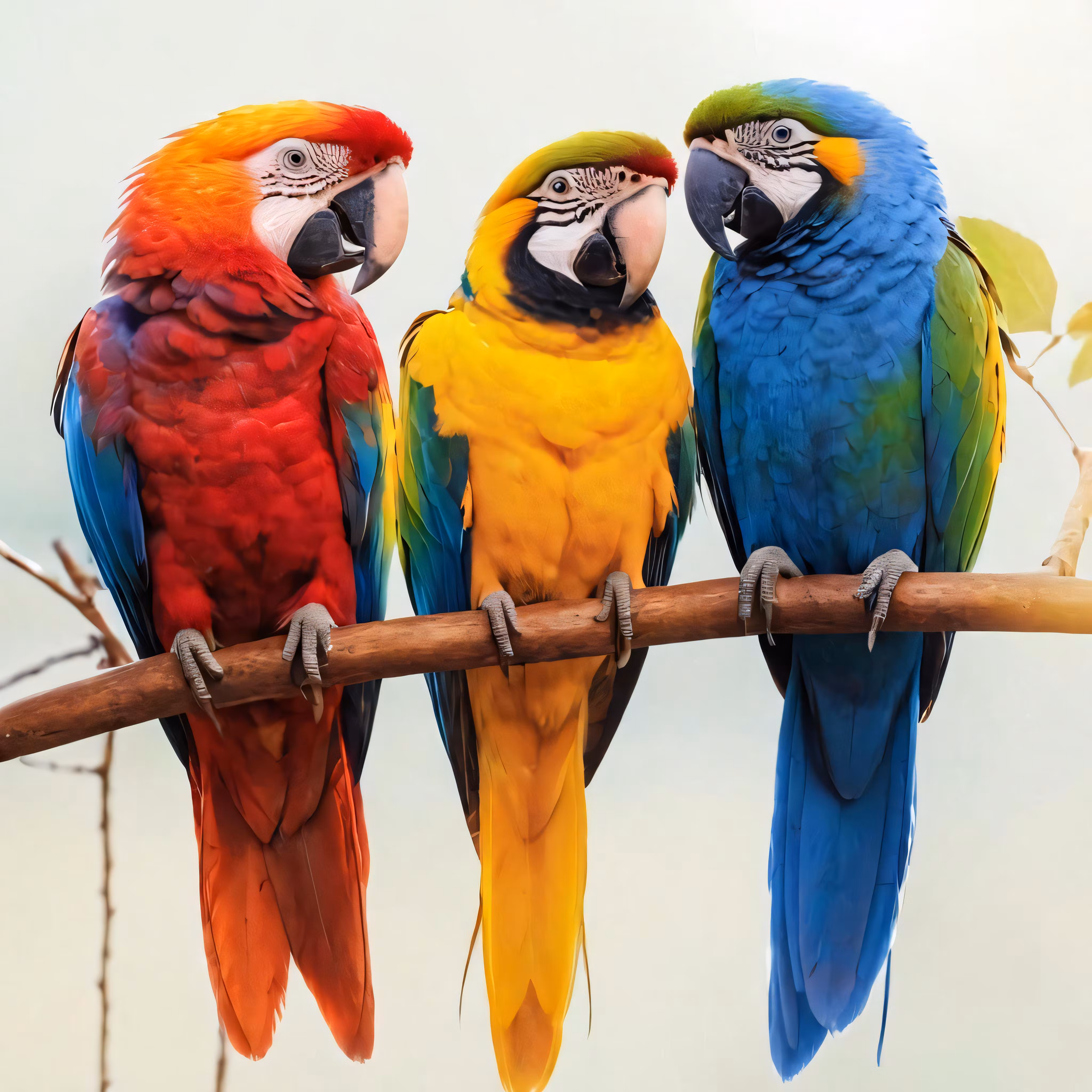 High resolution picture, free to use, four brightly colored parrots perched on a branch