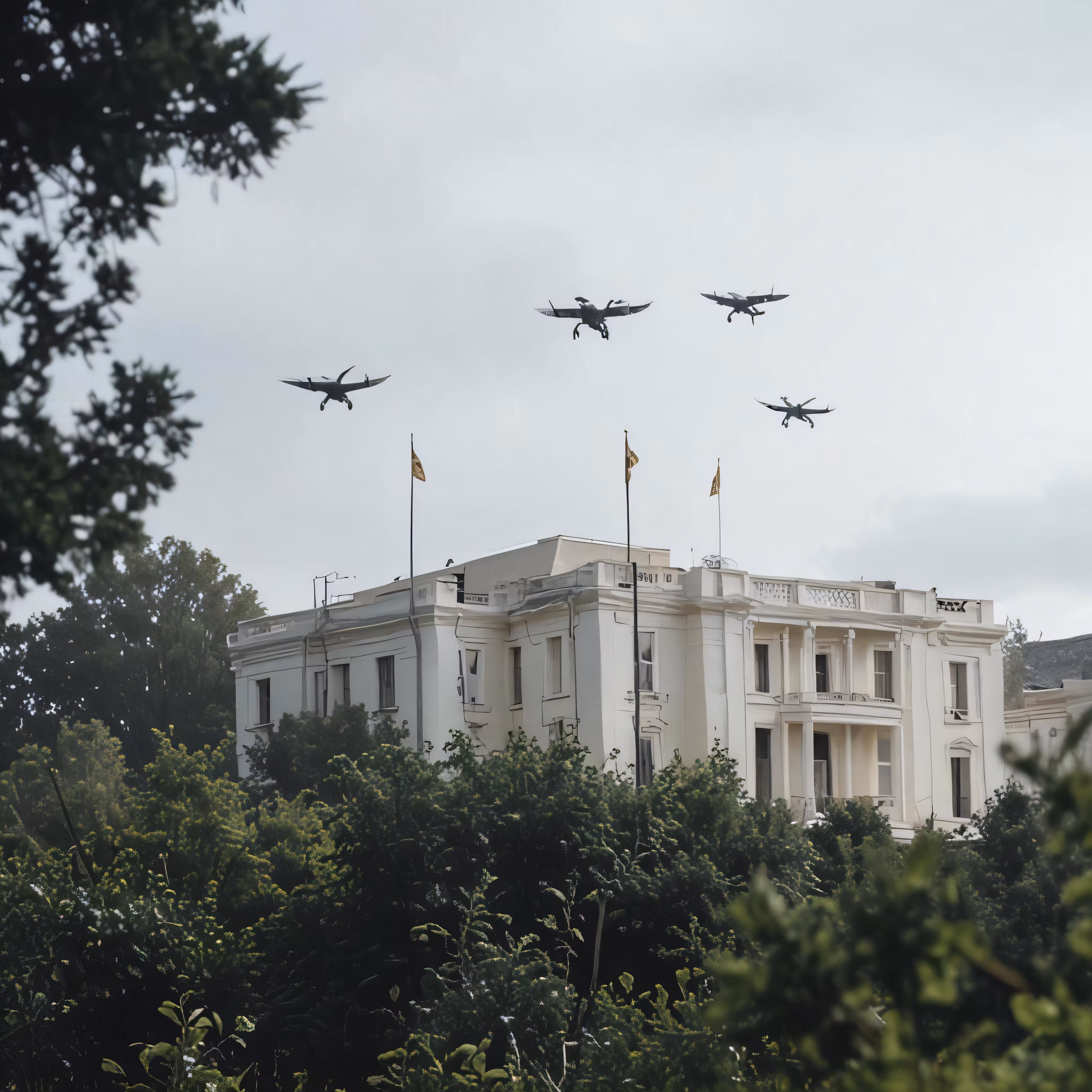 High resolution picture, free to use, four jet planes flying in the sky above an old building