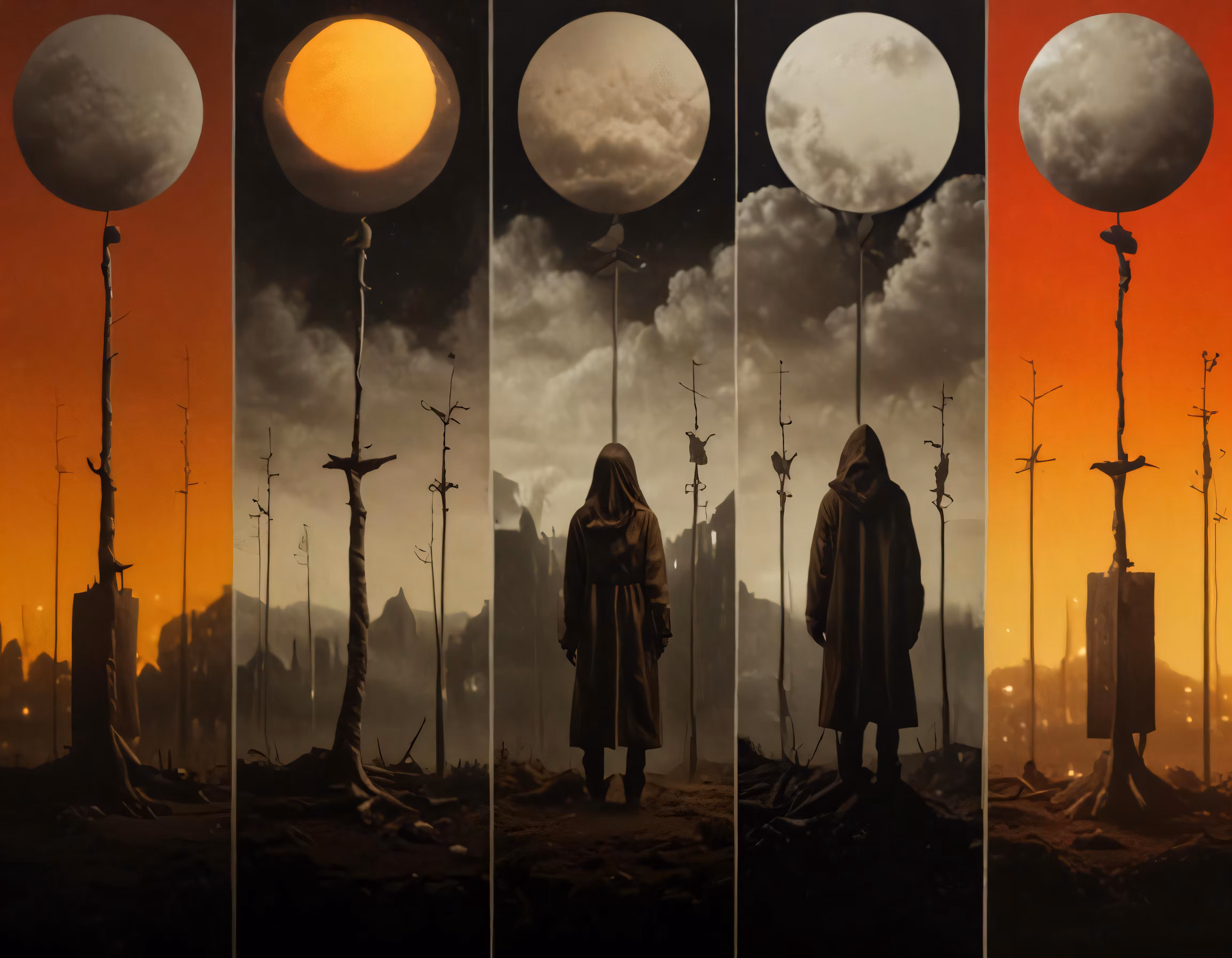 High resolution picture, free to use, four sides of the same painting depicting several different scenes, each of which appear to be two distant people