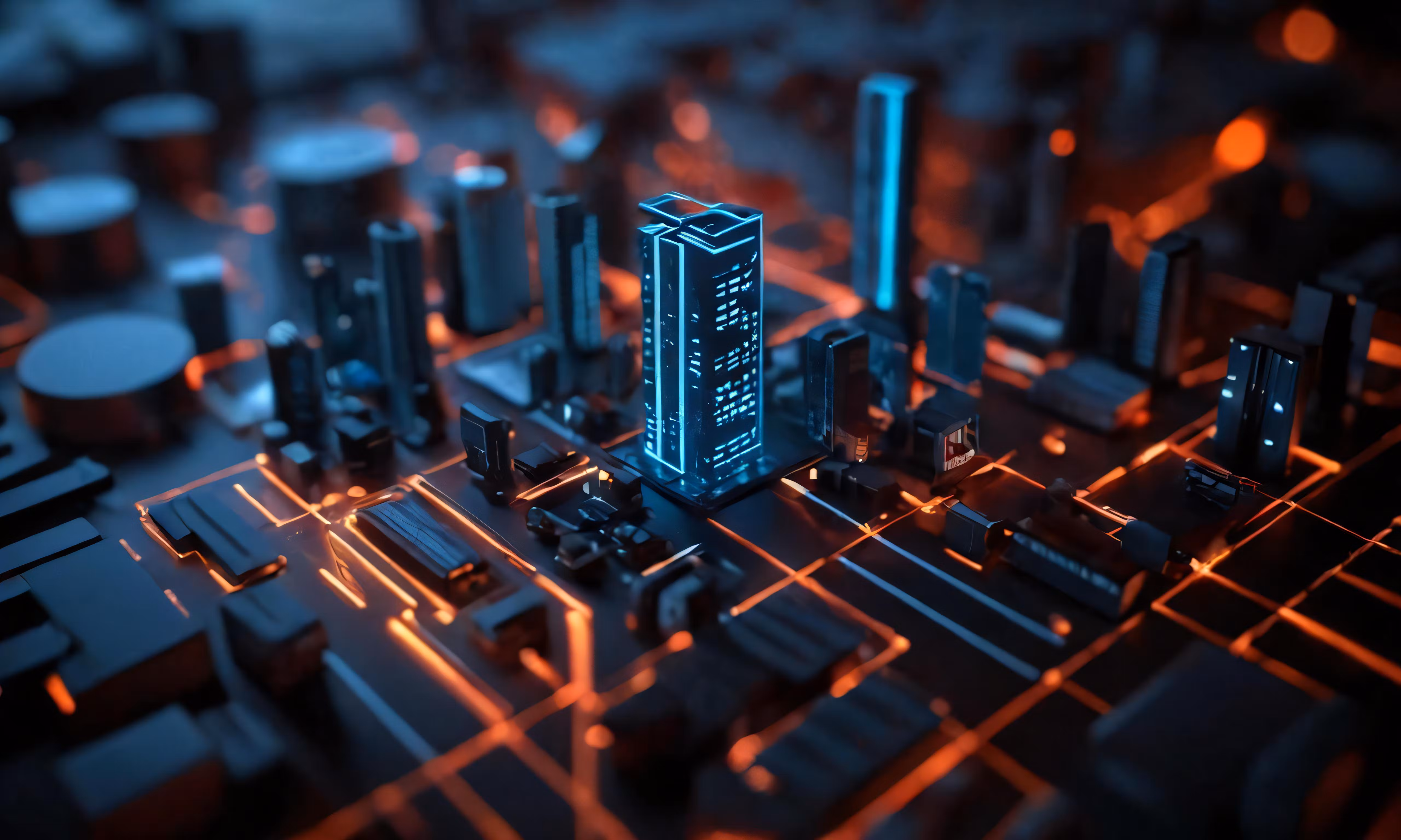 High resolution picture, free to use, futuristic cityscape with orange lighting on it