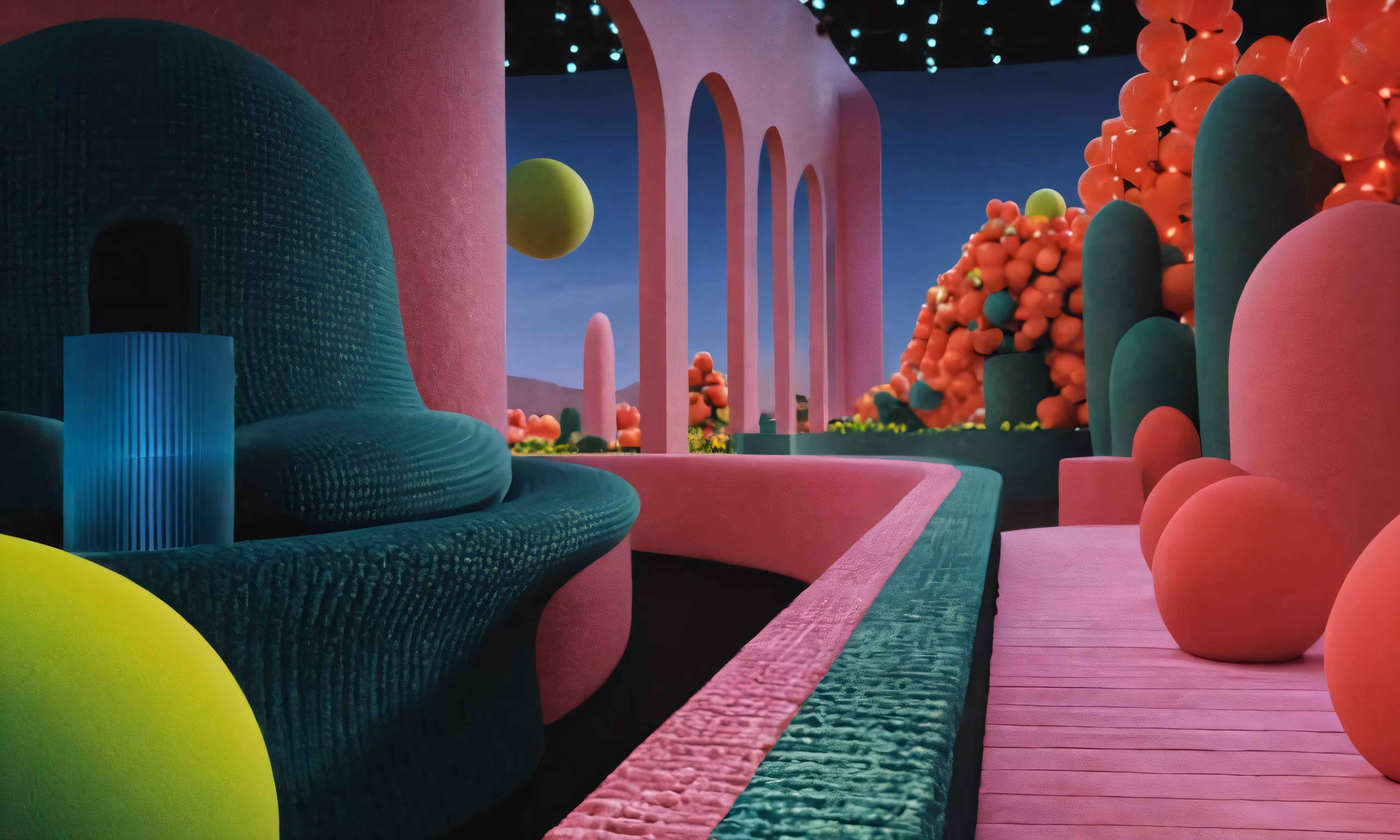High resolution picture, free to use, futuristic interior in pink and green, with balloons hanging from the ceiling