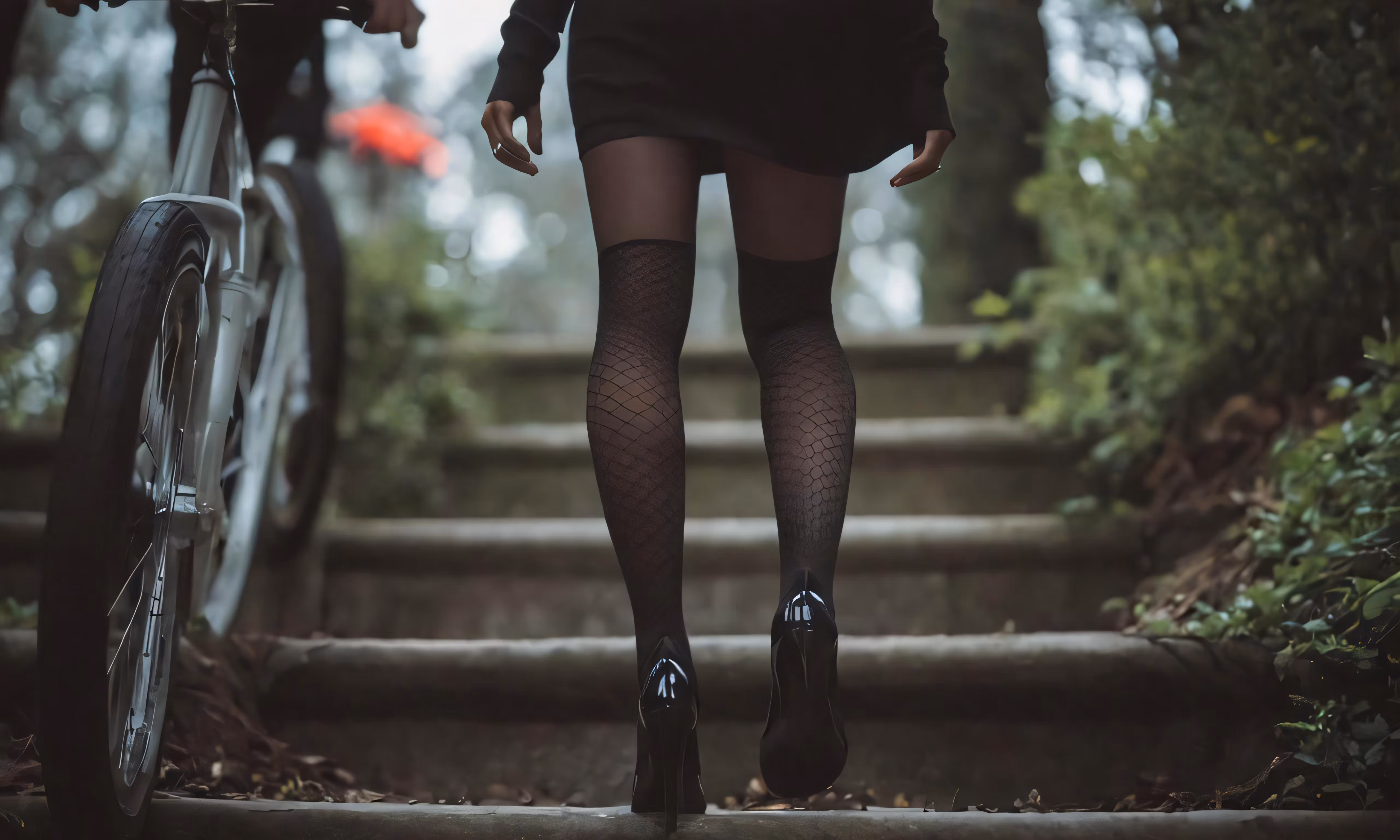 High resolution picture, free to use, girl in stockings and knee socks walking on stairs next to a bicycle