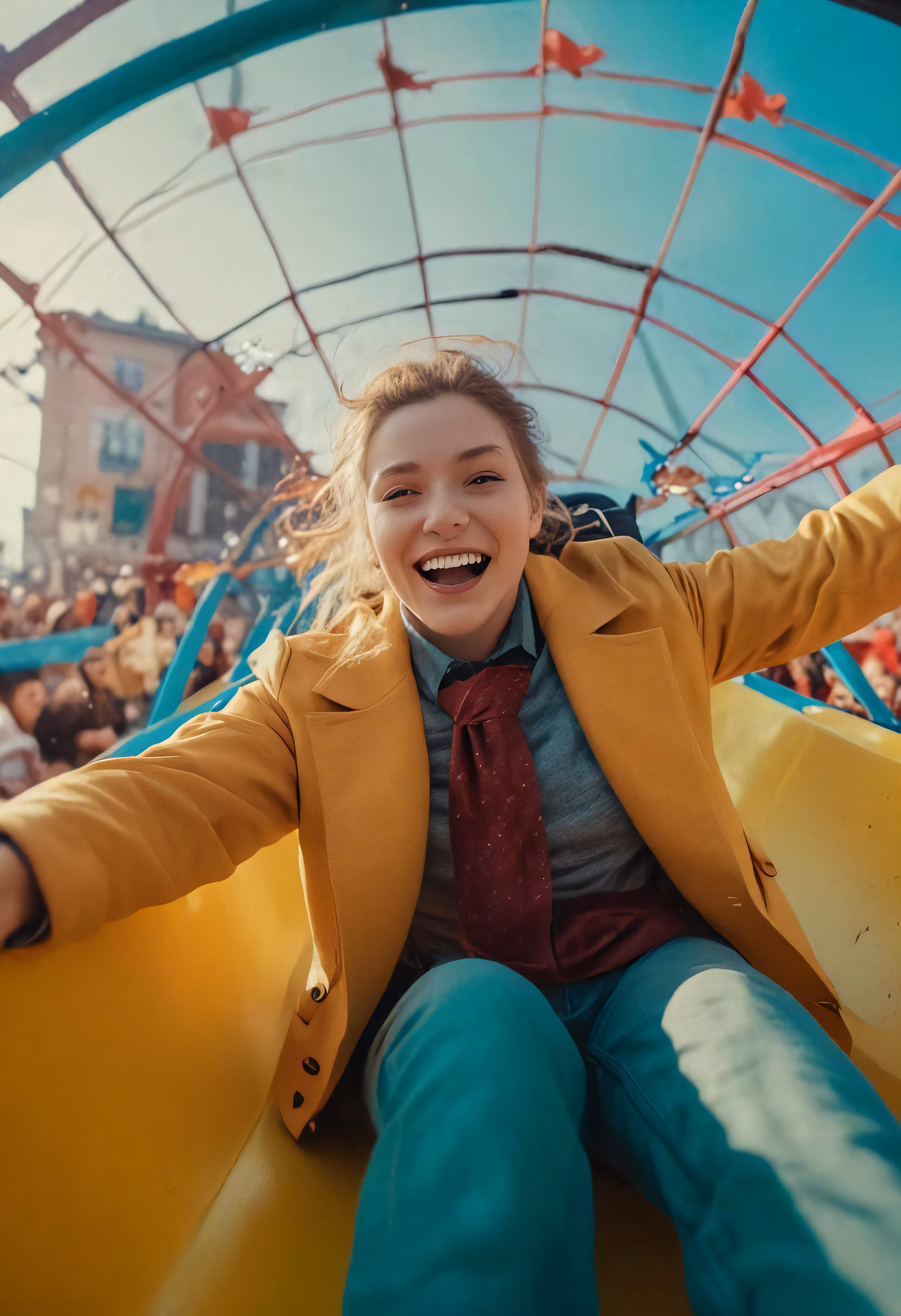 High resolution picture, free to use, girl on carnival ride with arms out smiling