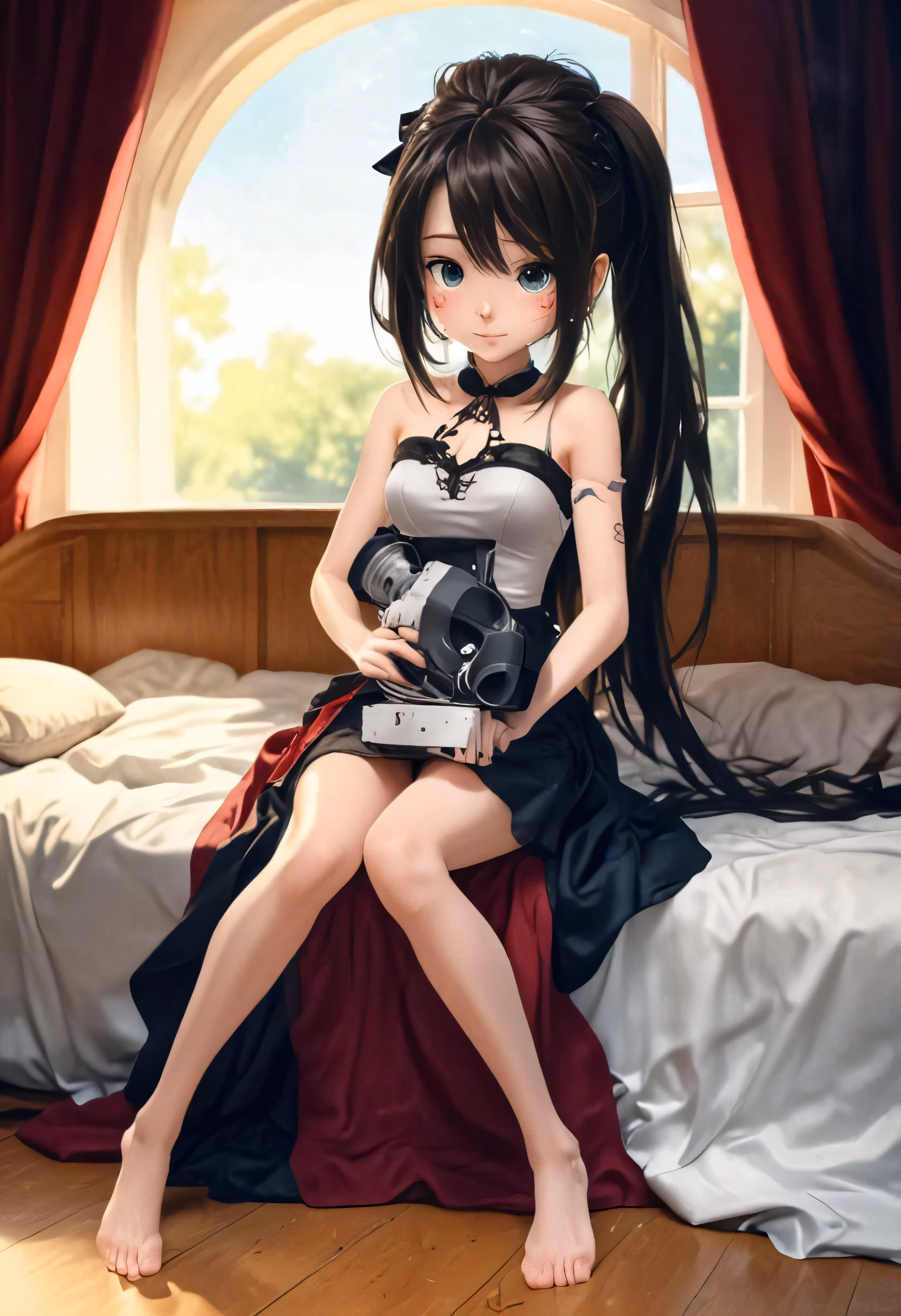 High resolution picture, free to use, girl posing in front of a window holding a camera