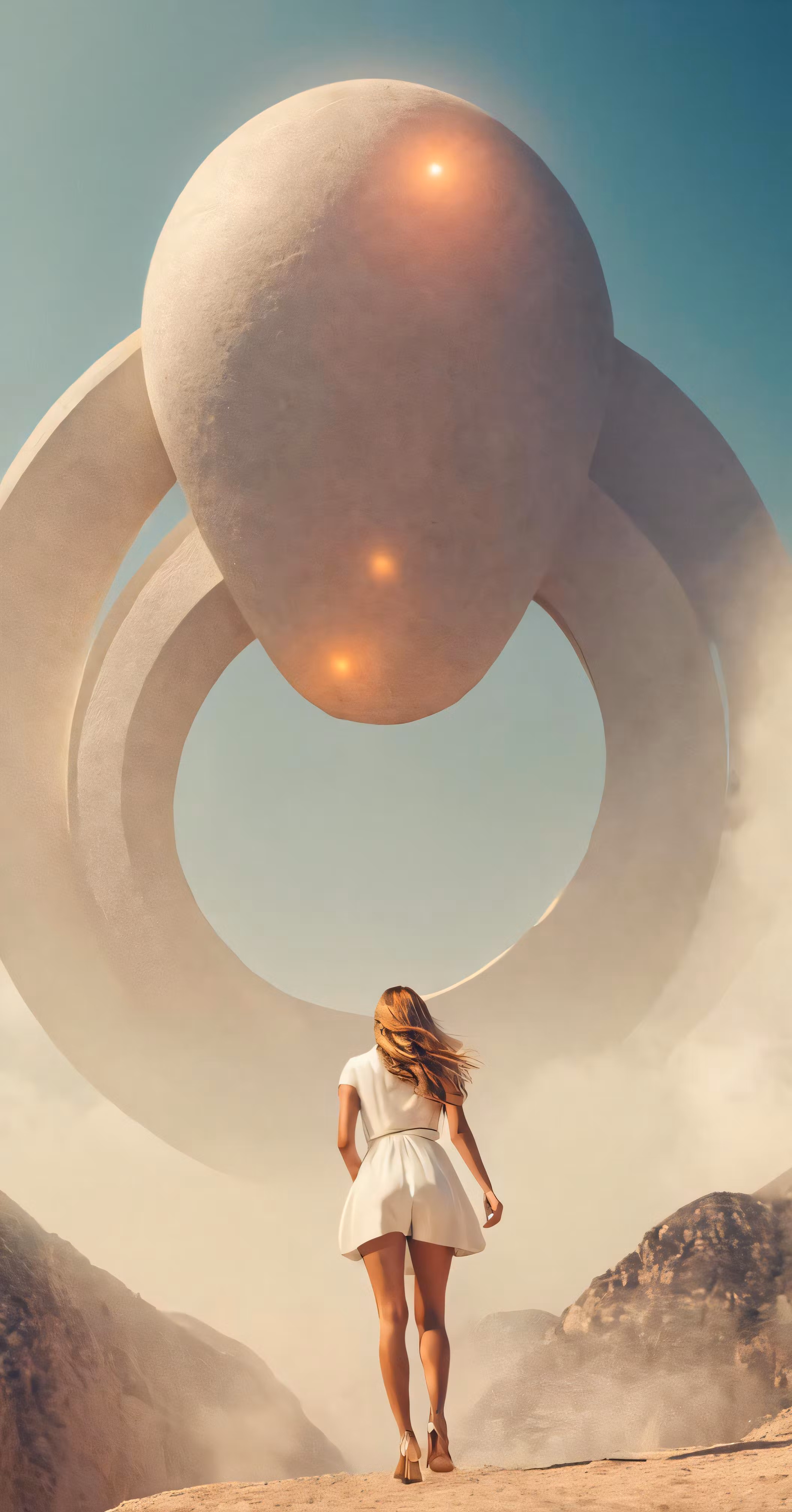High resolution picture, free to use, girl walking in front of artwork in desert