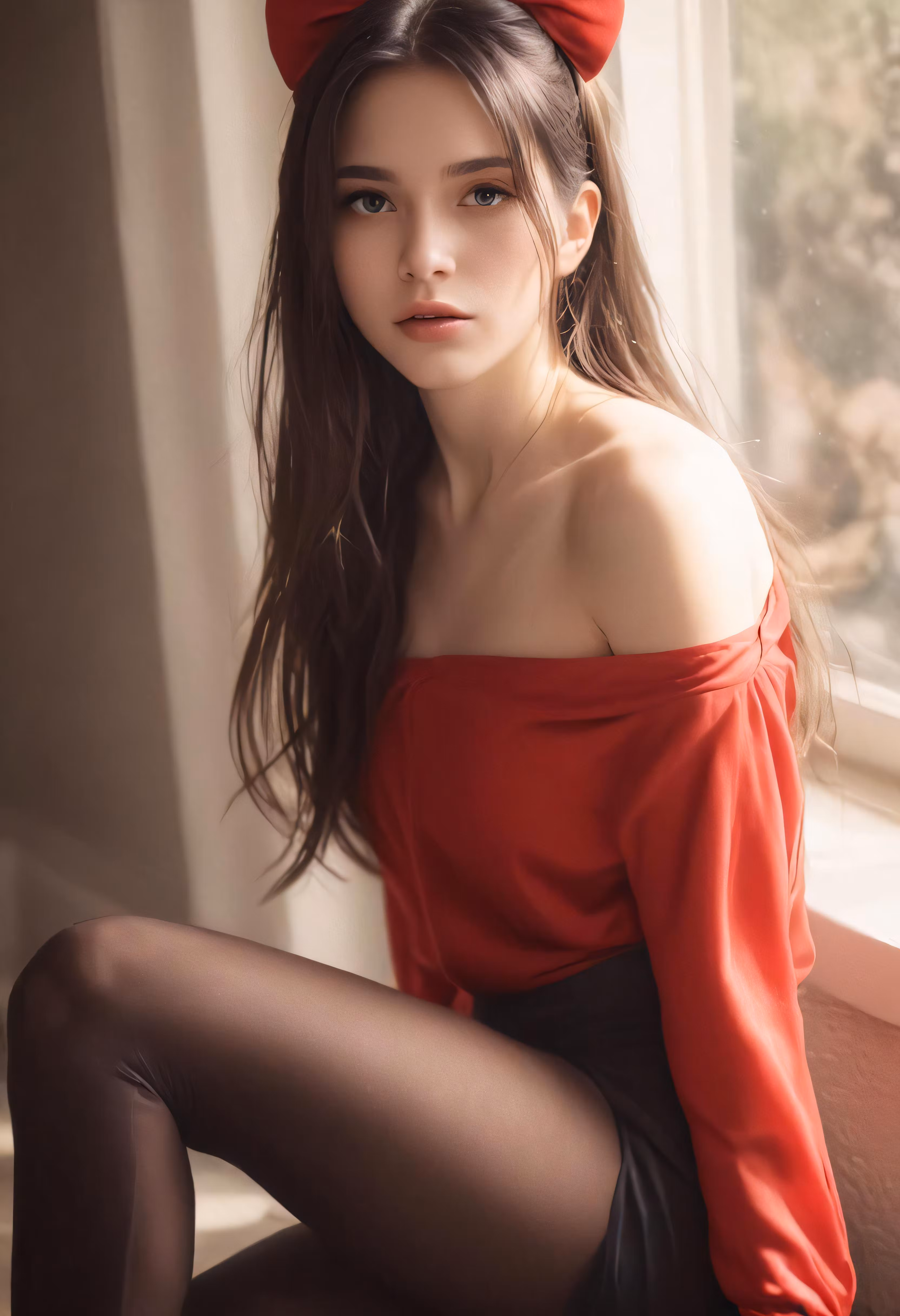 High resolution picture, free to use, girl wearing black stockings and red bow on top