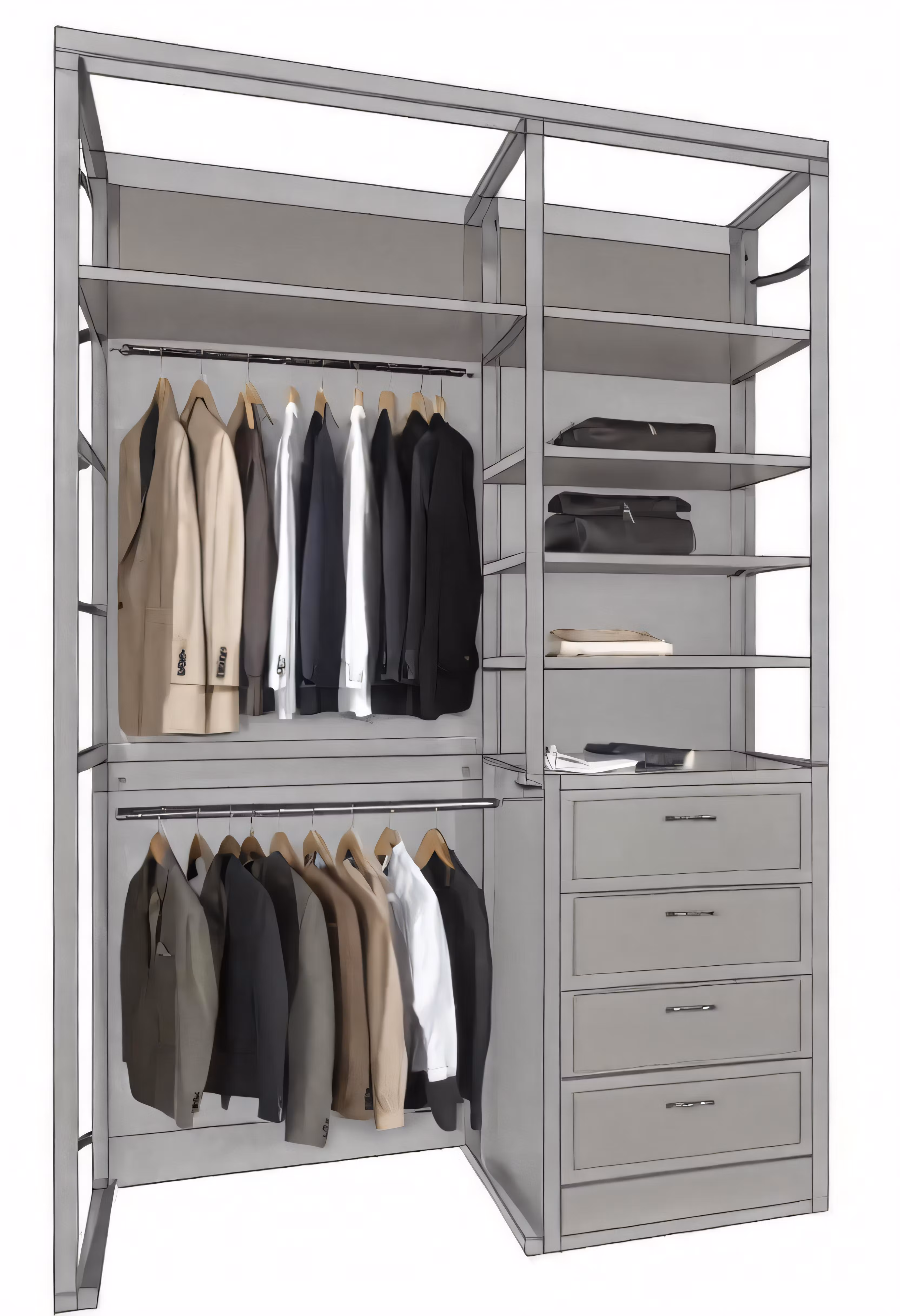 High resolution picture, free to use, grey and white closet with several coats and pants