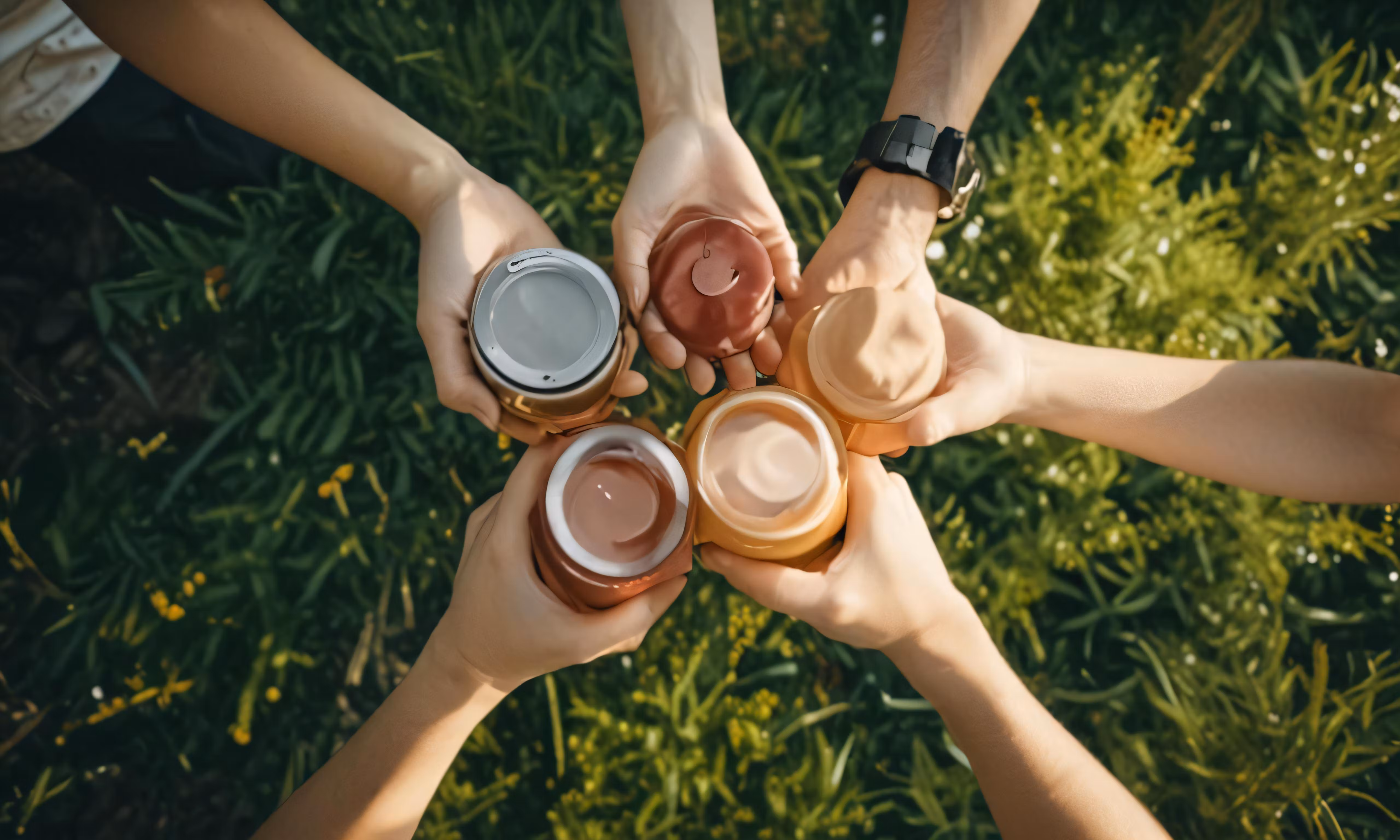 High resolution picture, free to use, group of young people holding drinks with jars in the shape of a star