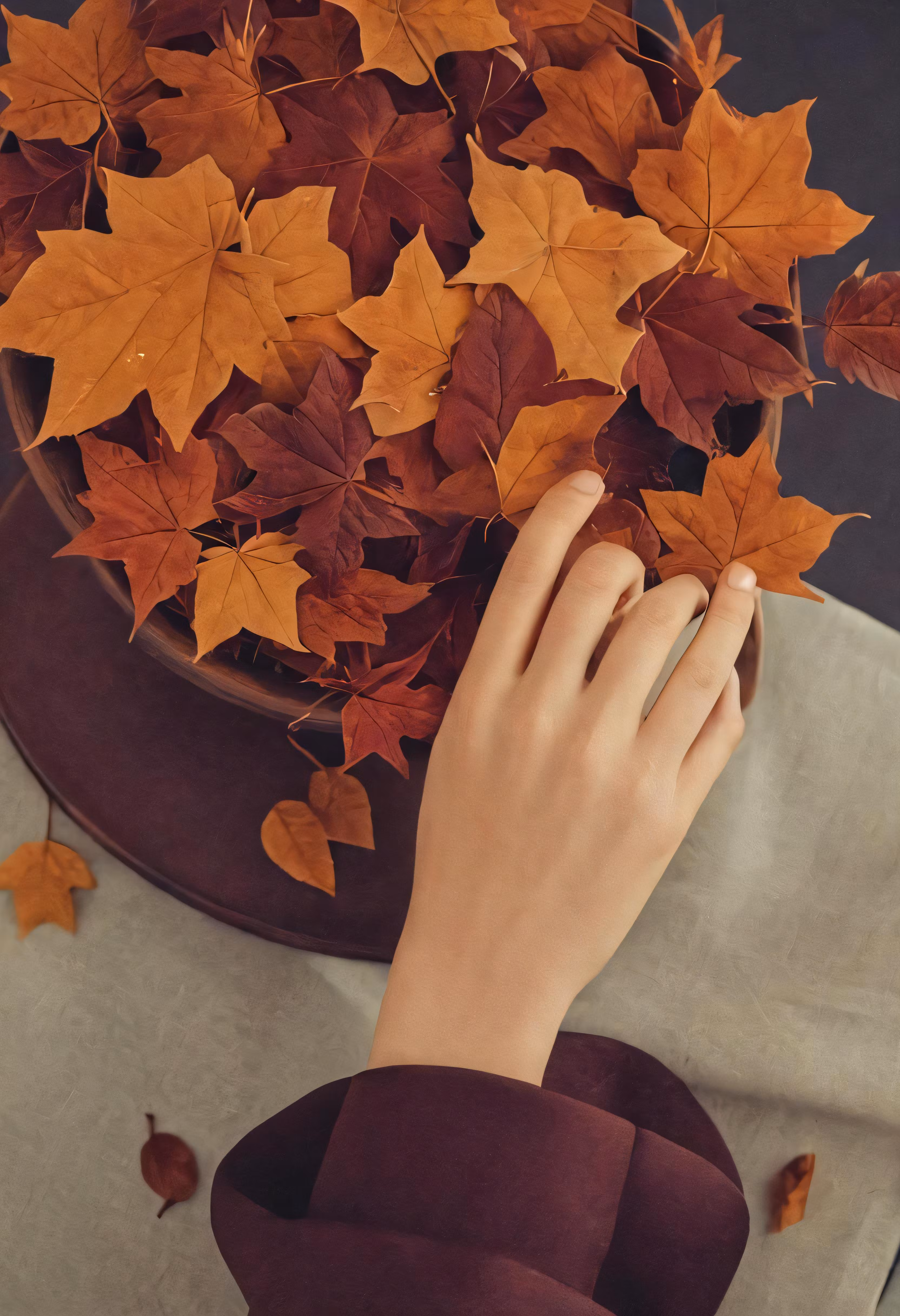 High resolution picture, free to use, hands grabbing onto a bunch of fall leaves