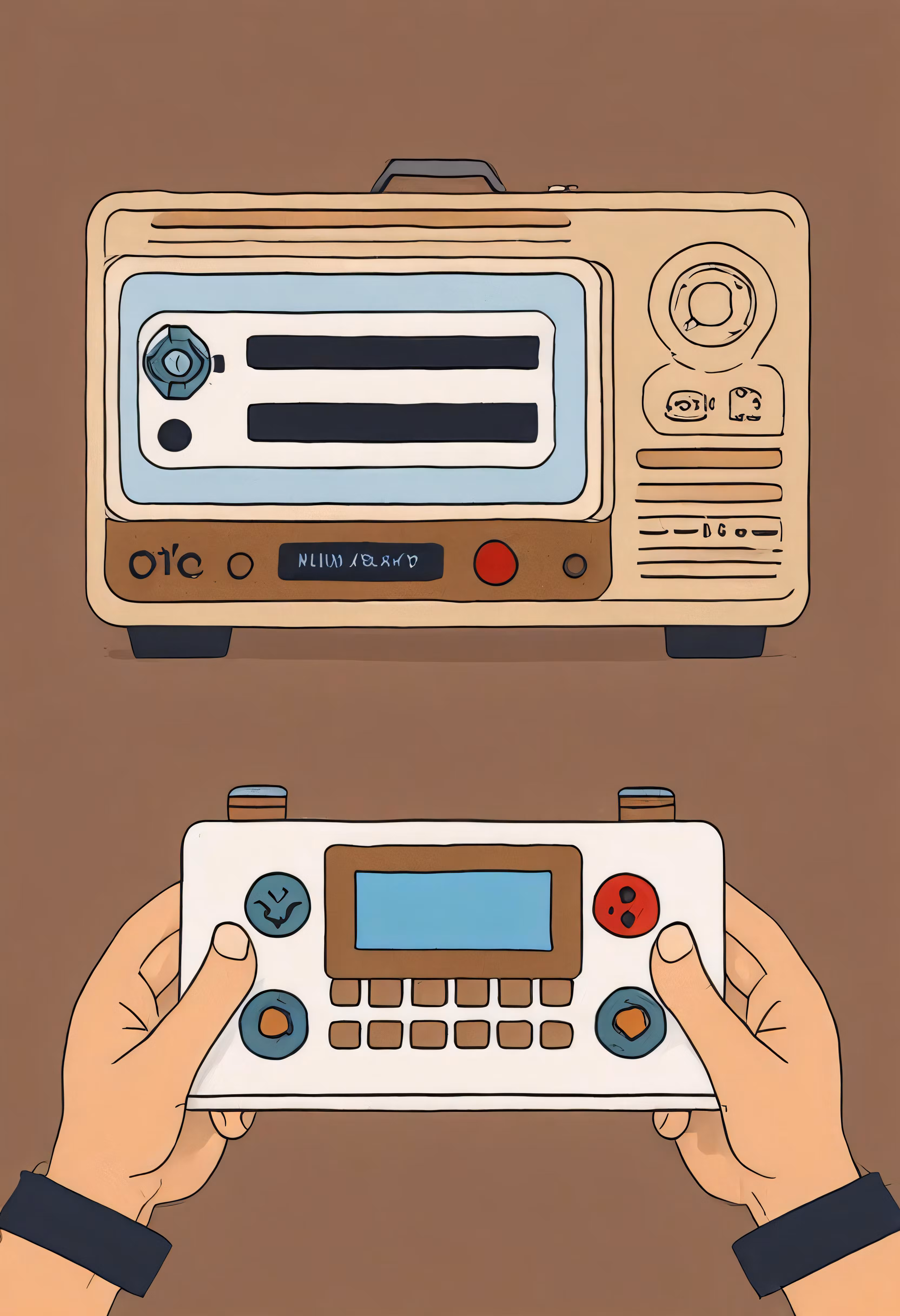 High resolution picture, free to use, hands holding a small white radio next to a large, old style radio