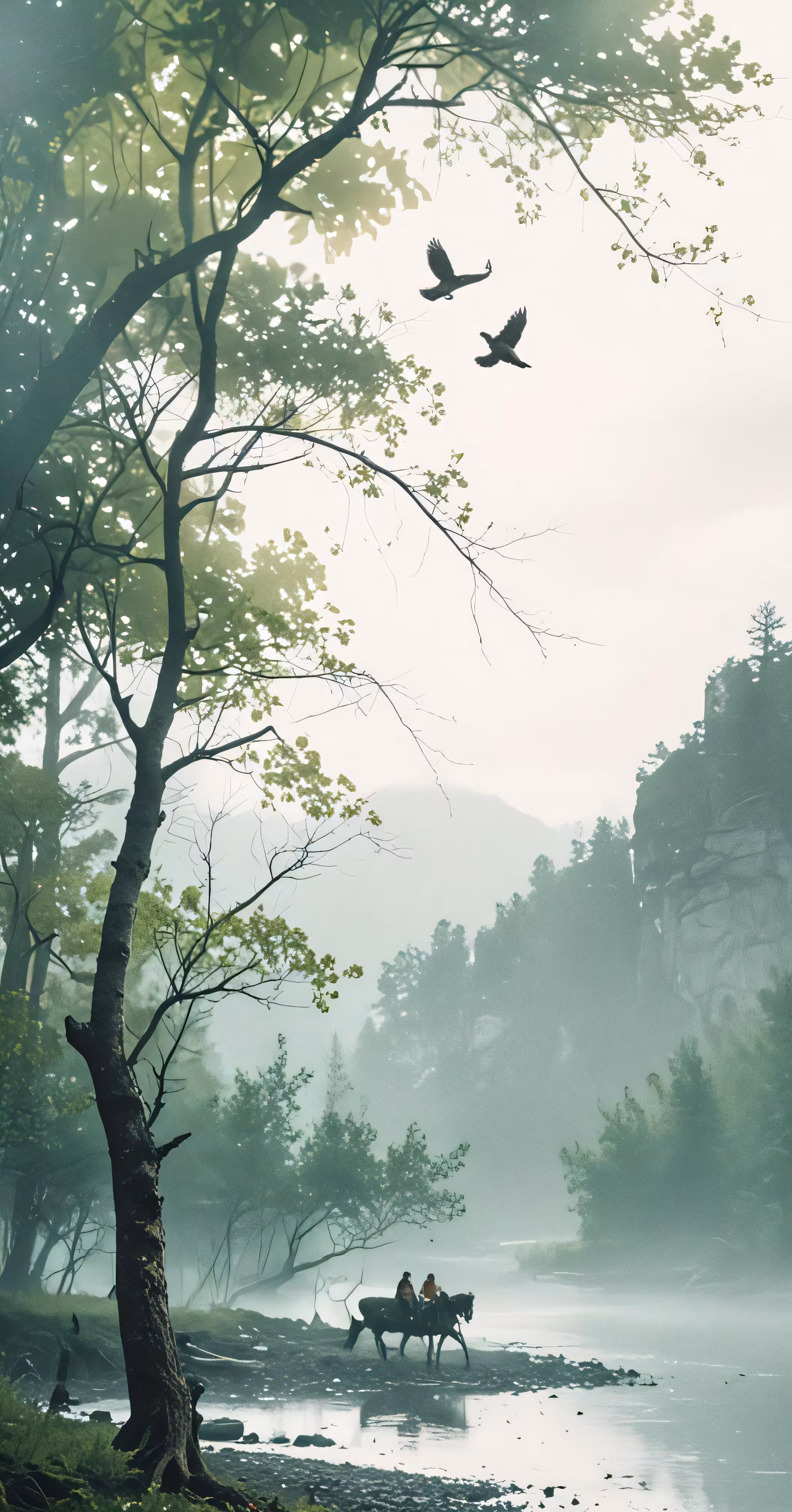 High resolution picture, free to use, horses and riders walking through the river while birds fly overhead