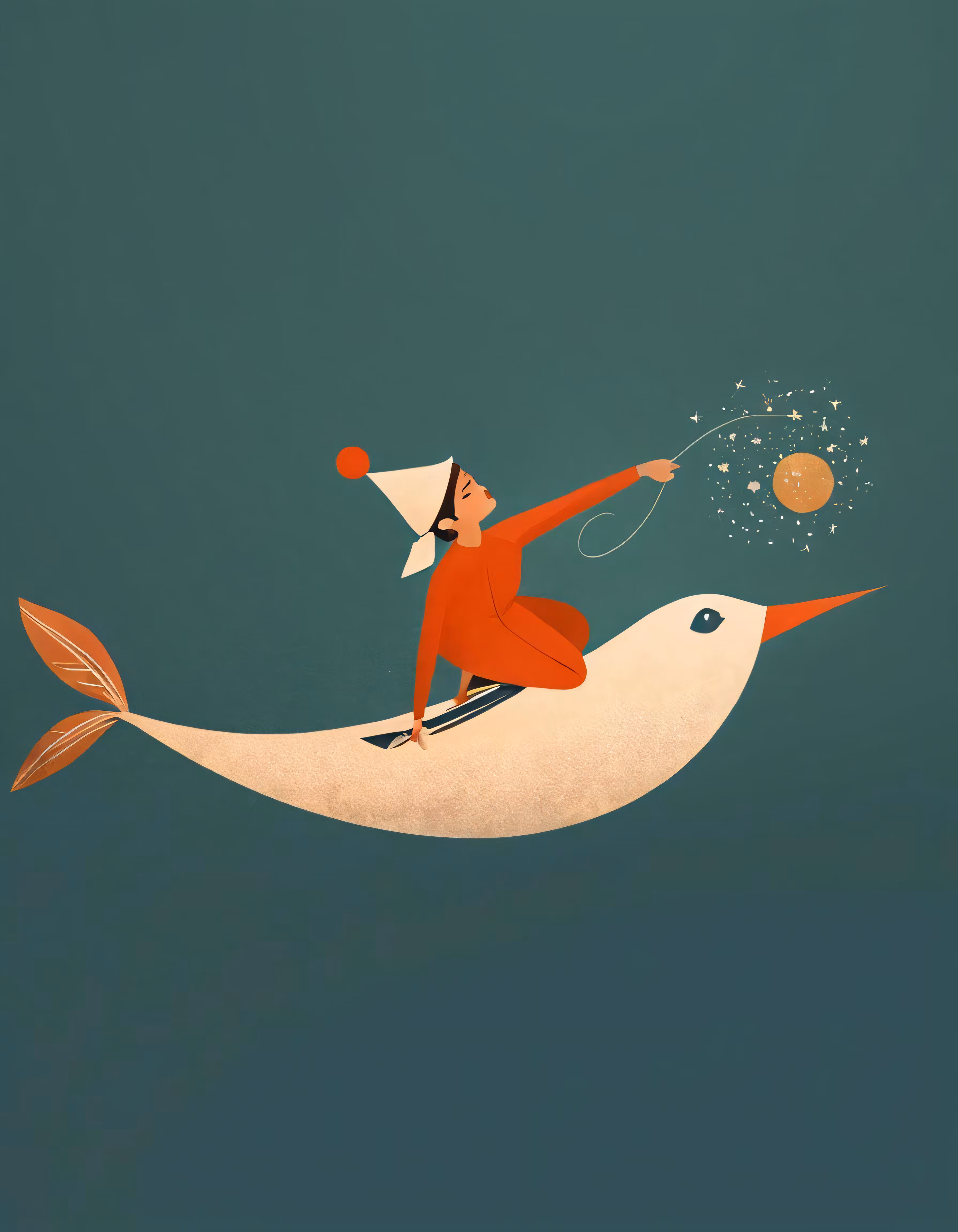 High resolution picture, free to use, illustration of woman riding on top of a bird
