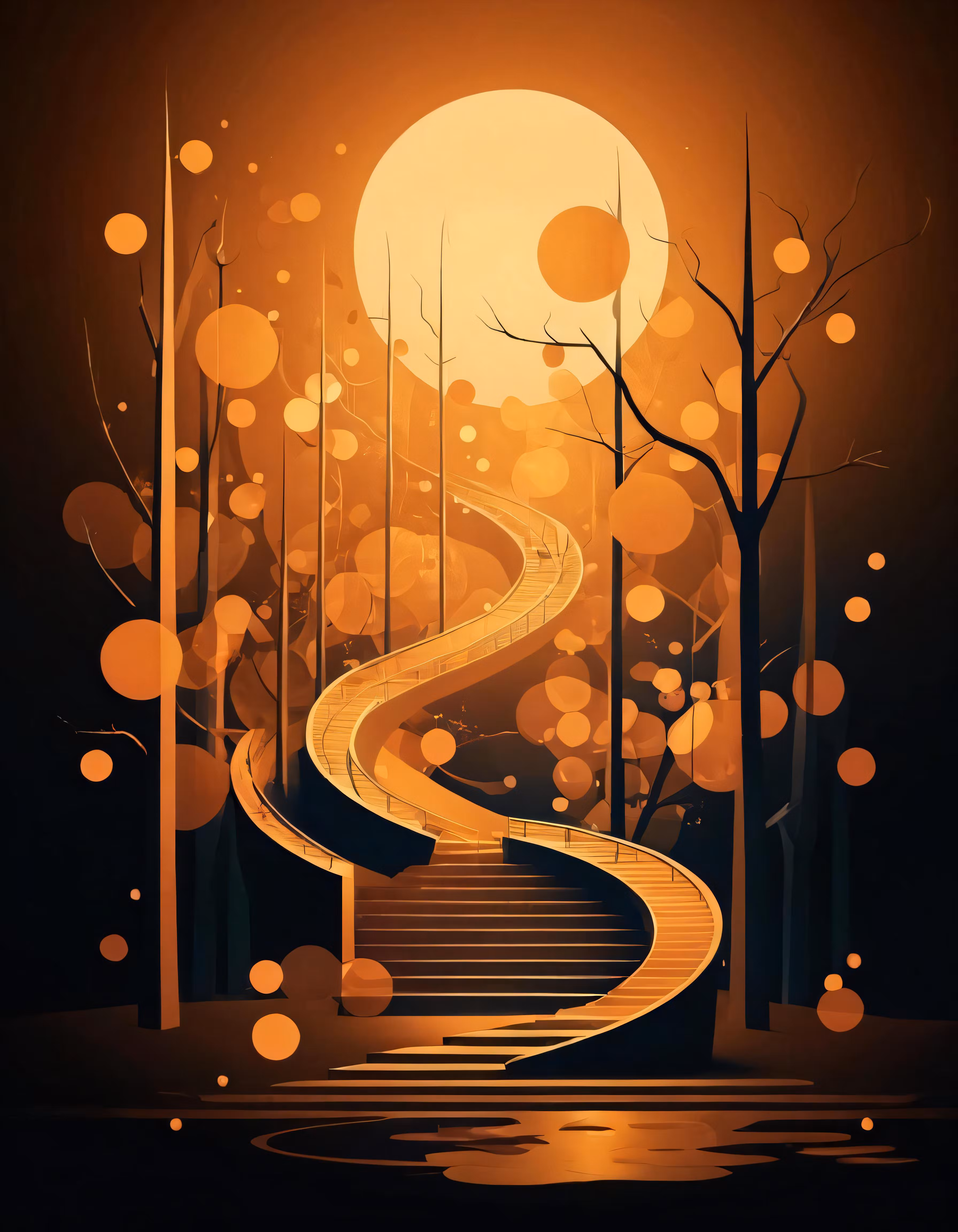 High resolution picture, free to use, illustration painting of steps leading to a dark moon lit forest