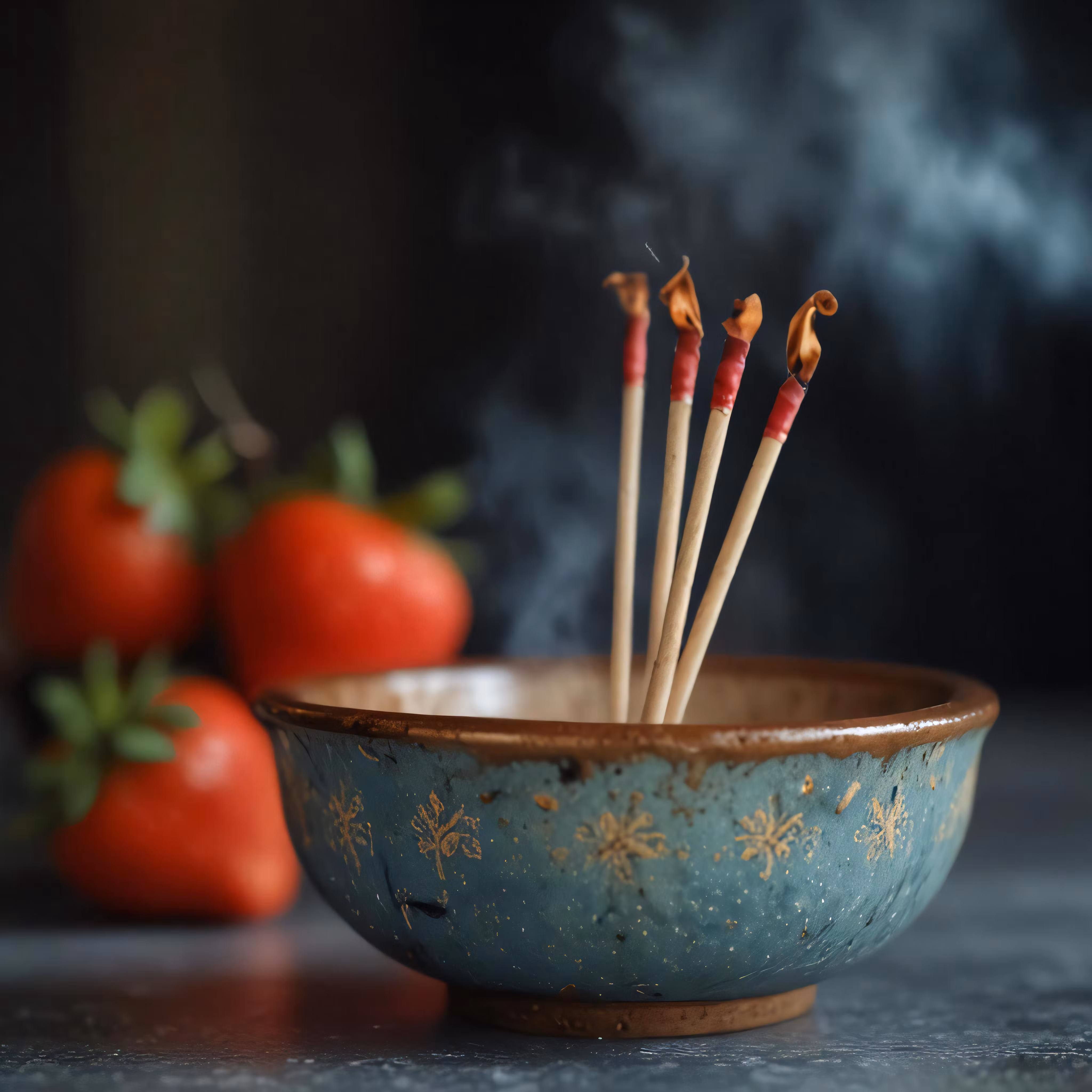 High resolution picture, free to use, incense sticks sticking out from a bowl in the process of steaming