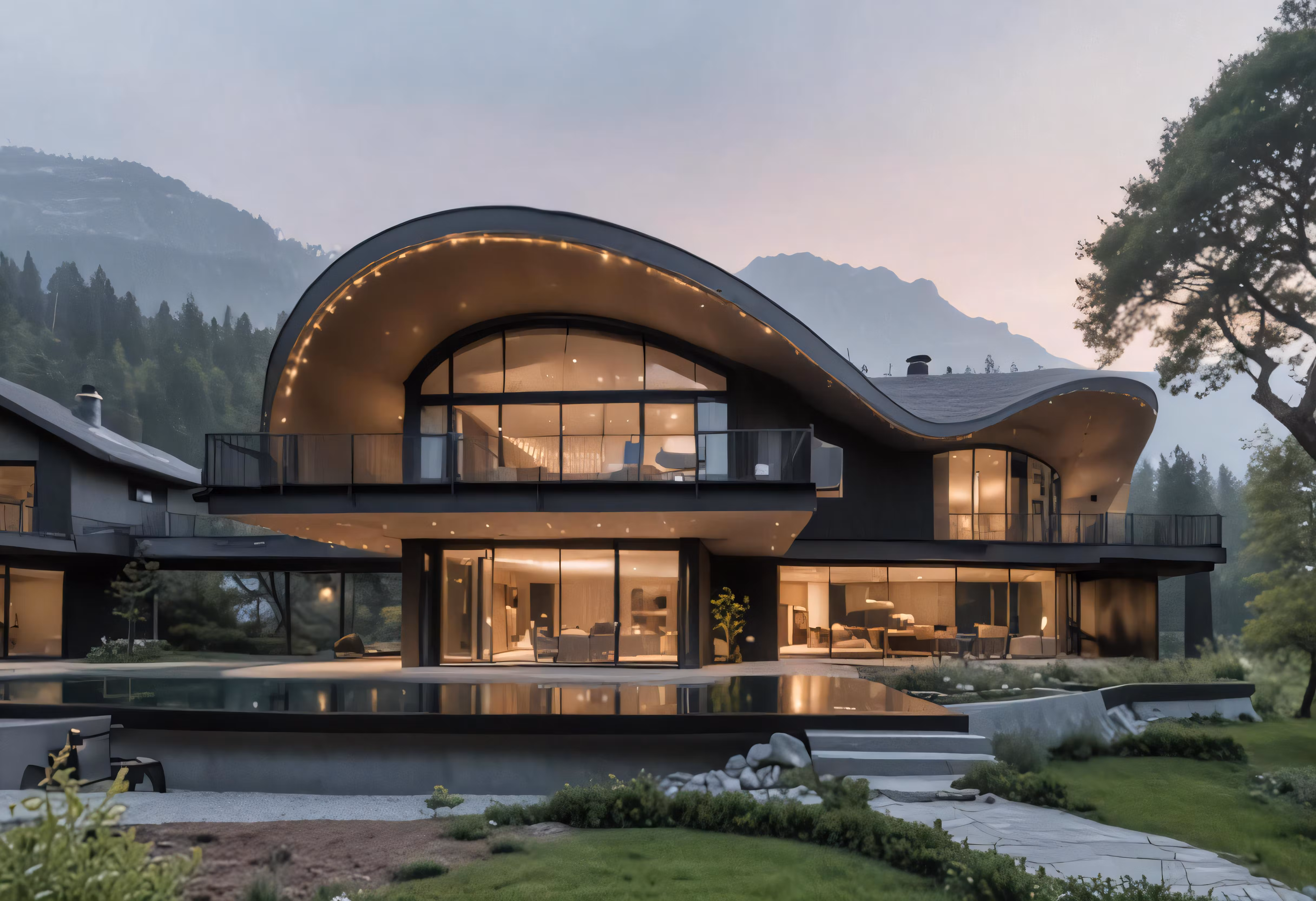 High resolution picture, free to use, large, curved home sitting in a beautiful setting