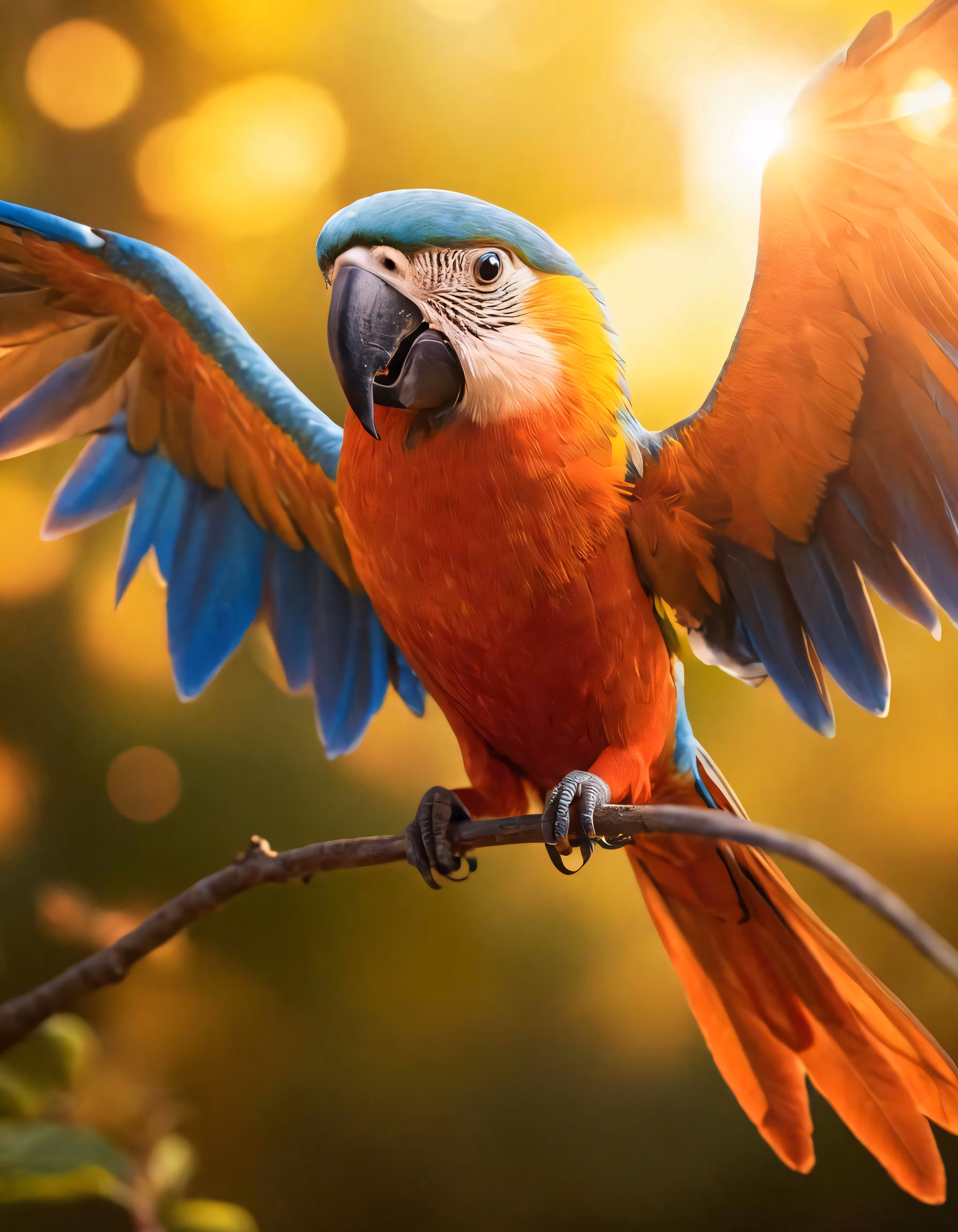 High resolution picture, free to use, large blue and orange parrot perched on a branch