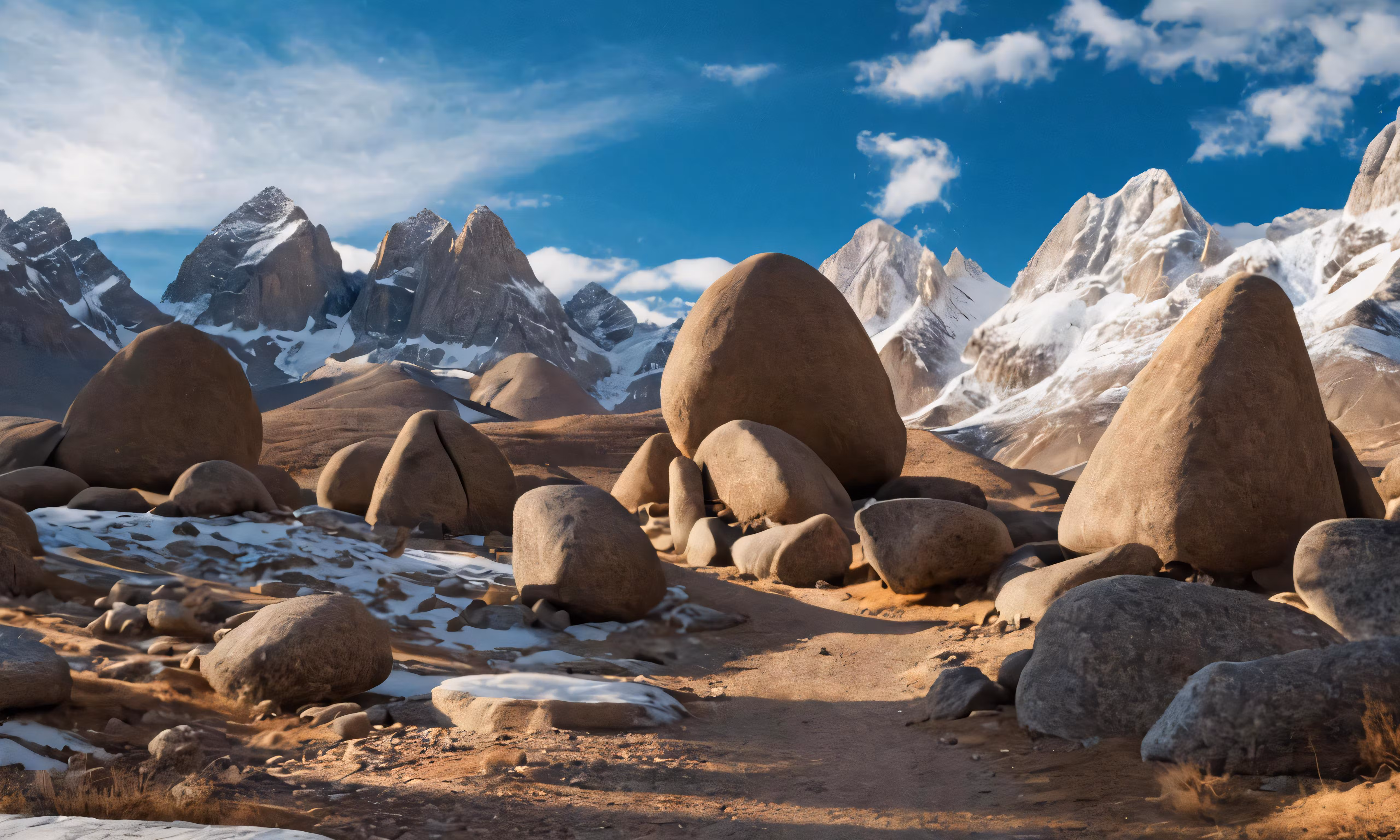 High resolution picture, free to use, large boulders in the mountains with snow covered peaks