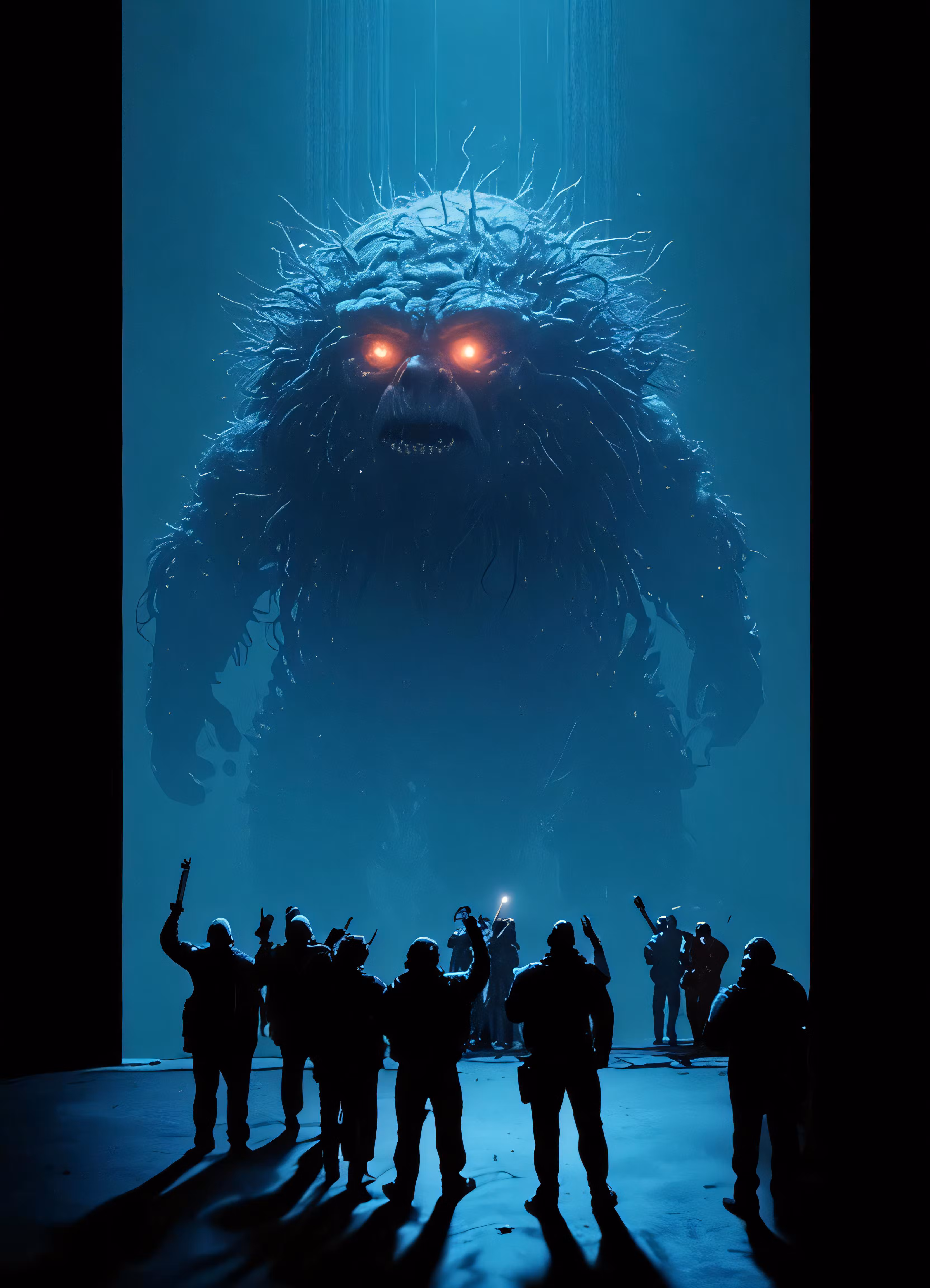 High resolution picture, free to use, large monster in a dark room surrounded by silhouettes