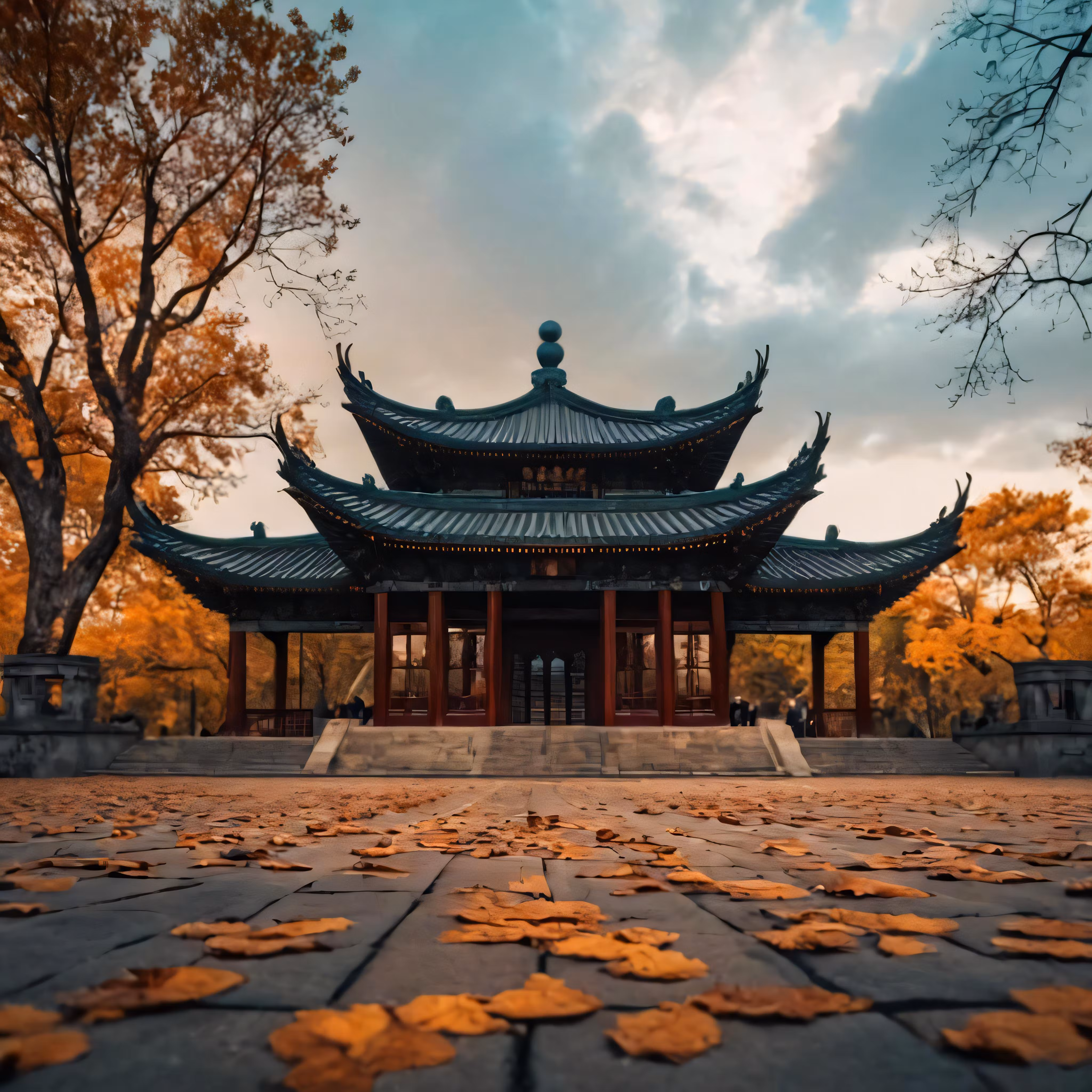 High resolution picture, free to use, leaves in front of a pagoda in autumn