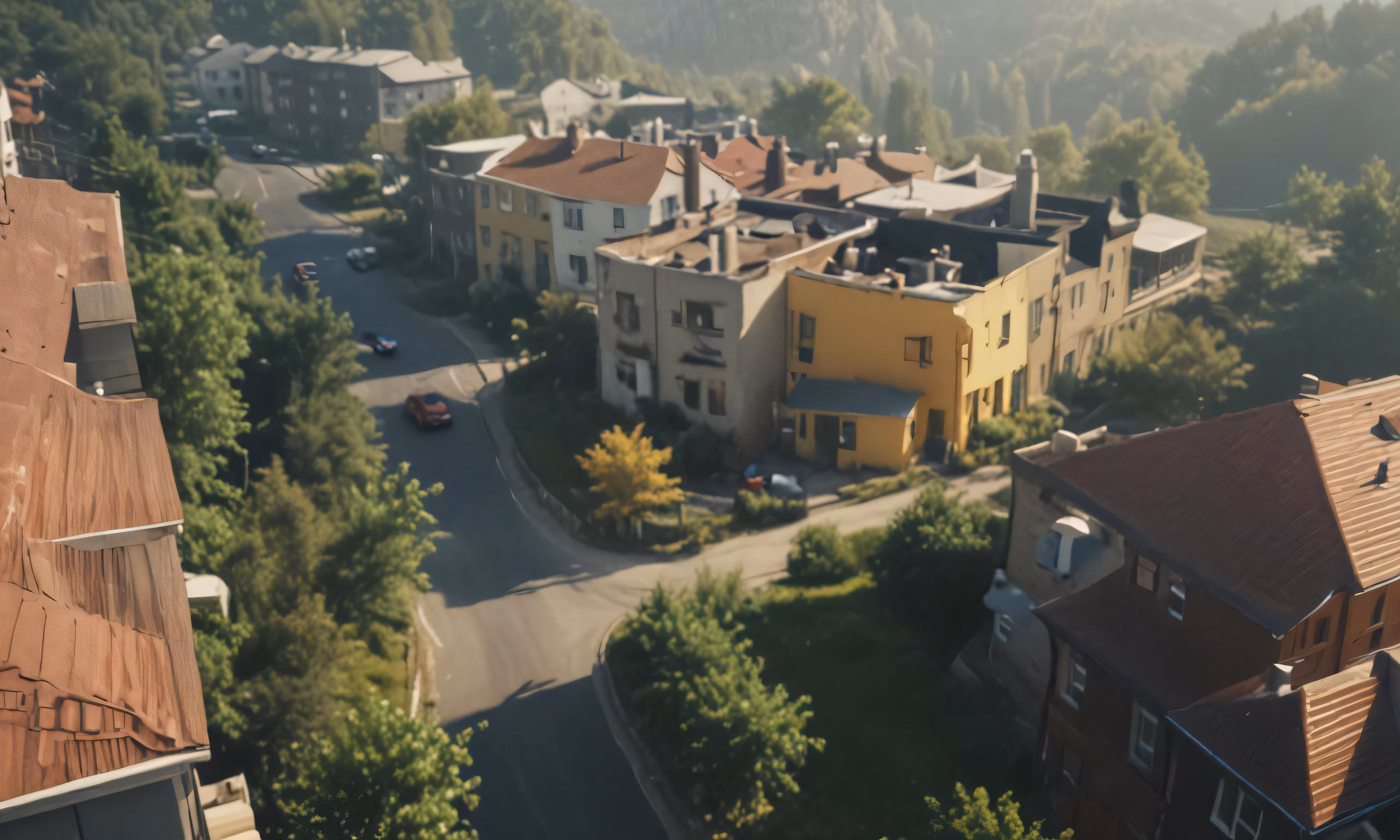 High resolution picture, free to use, looking down on a row of houses along a road in the foreground