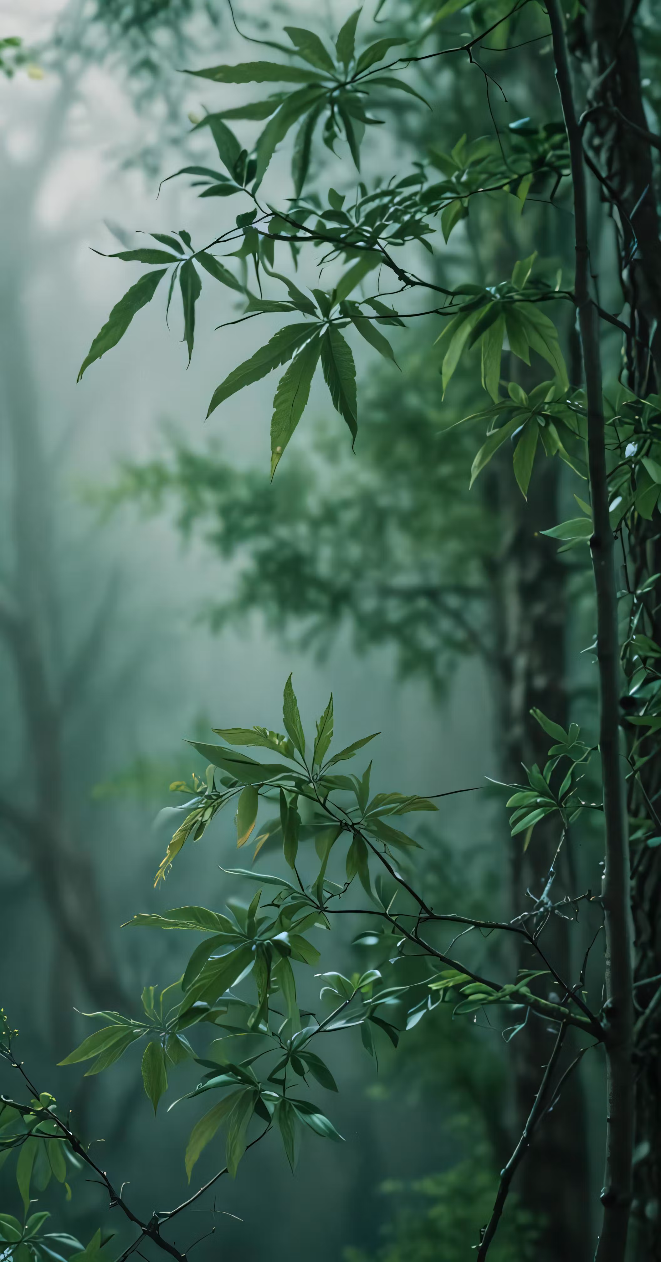 High resolution picture, free to use, lush green trees are seen in the foggy forest
