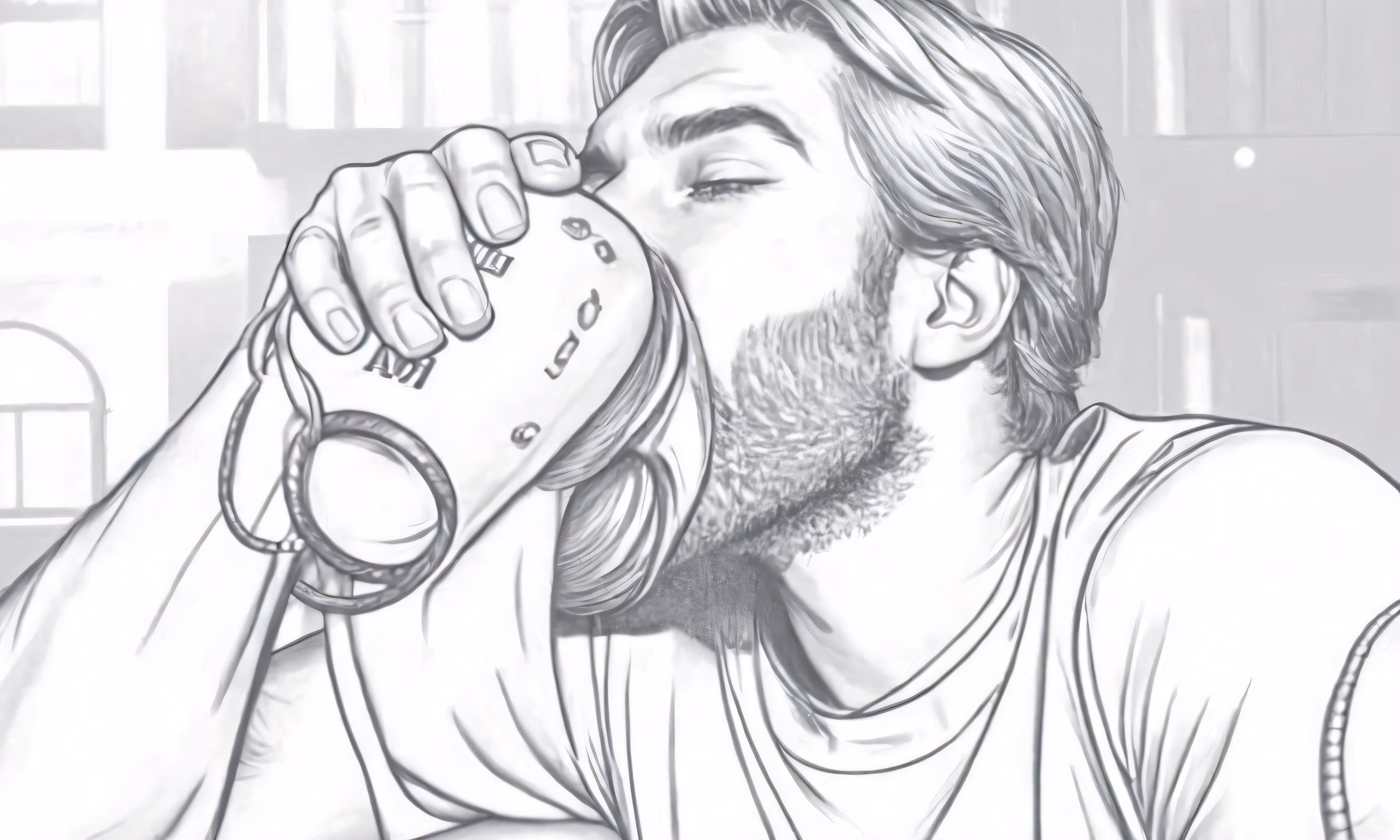 High resolution picture, free to use, man drinking from a cup on the table in a room