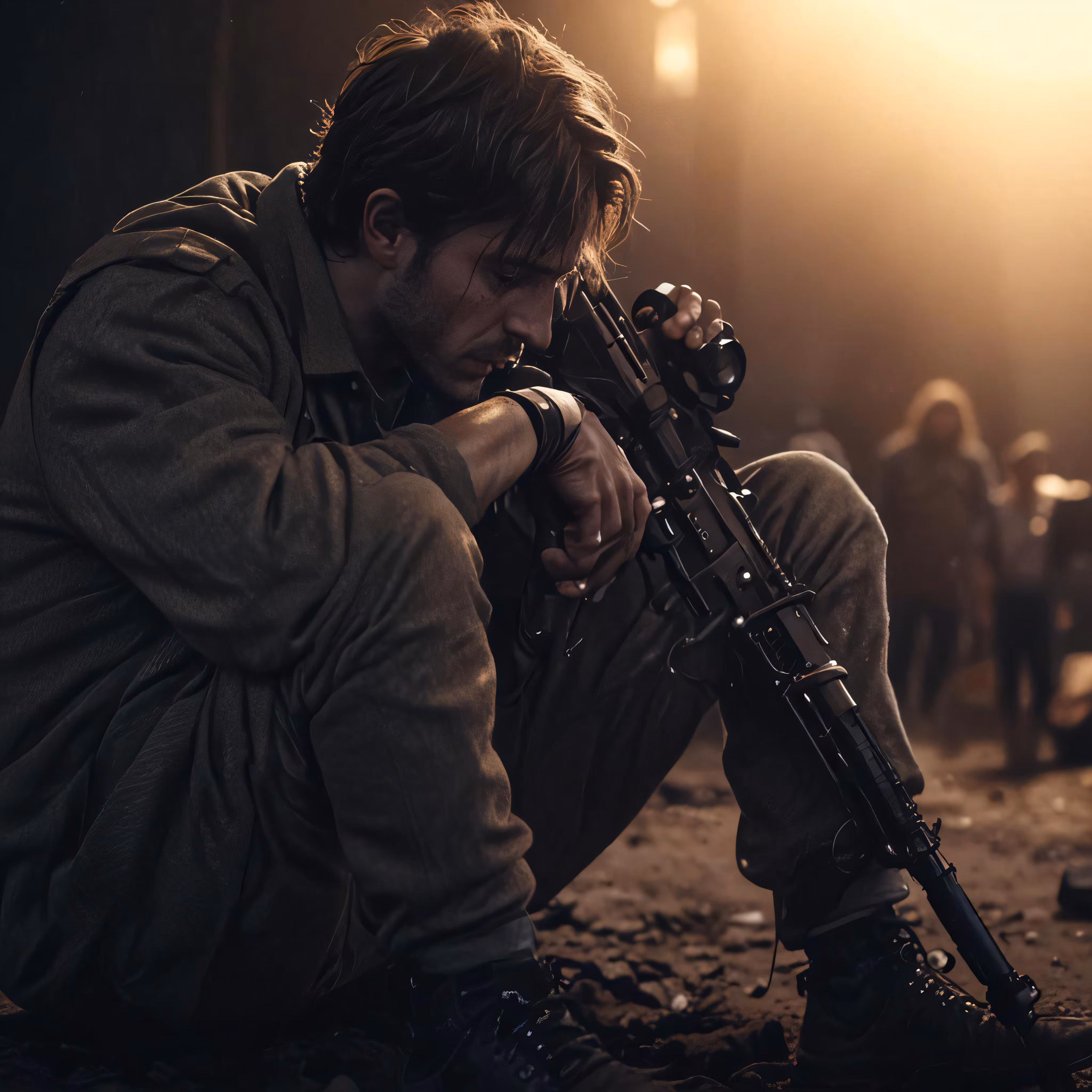 High resolution picture, free to use, man holding up his rifle sitting on a dirty field