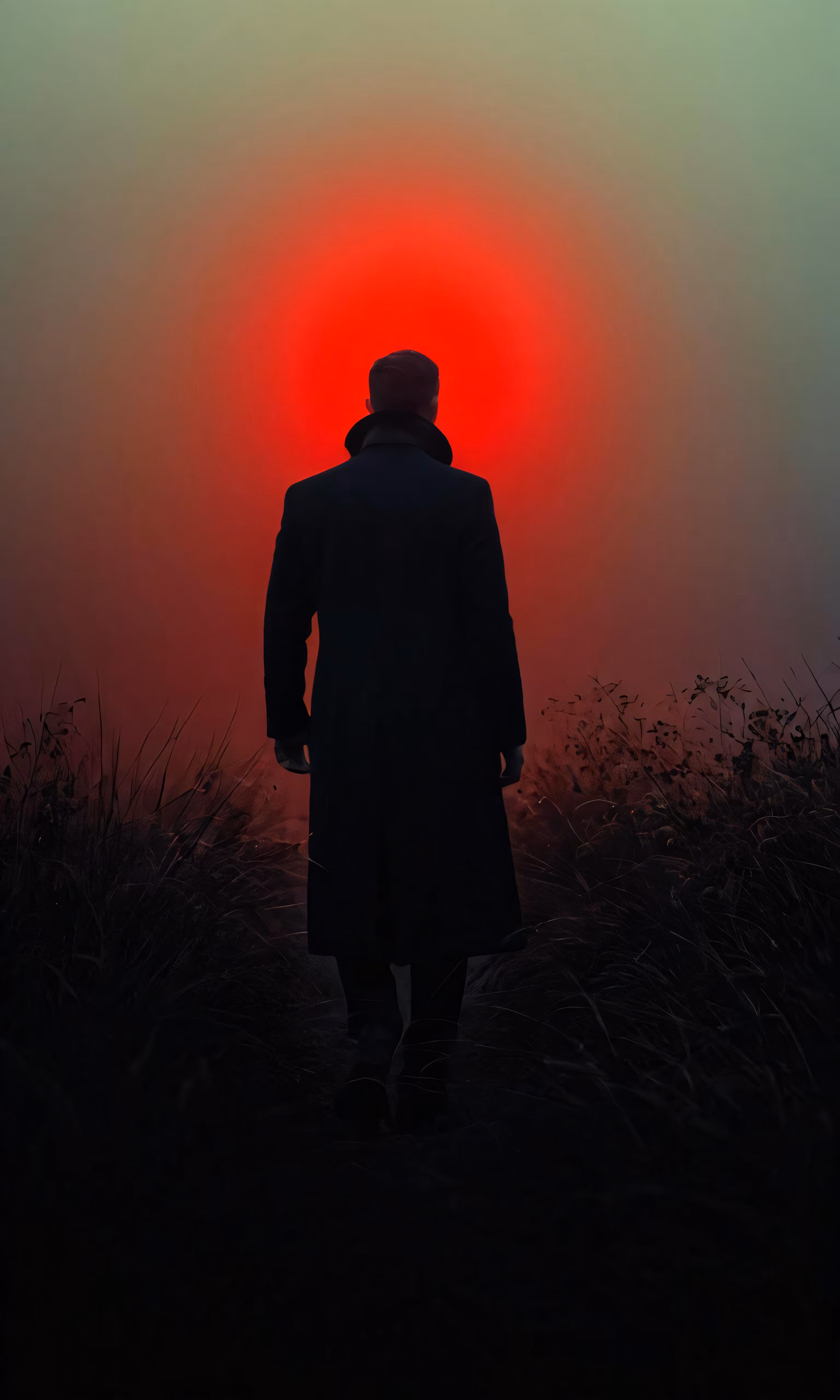 High resolution picture, free to use, man in a coat walking towards an orange light