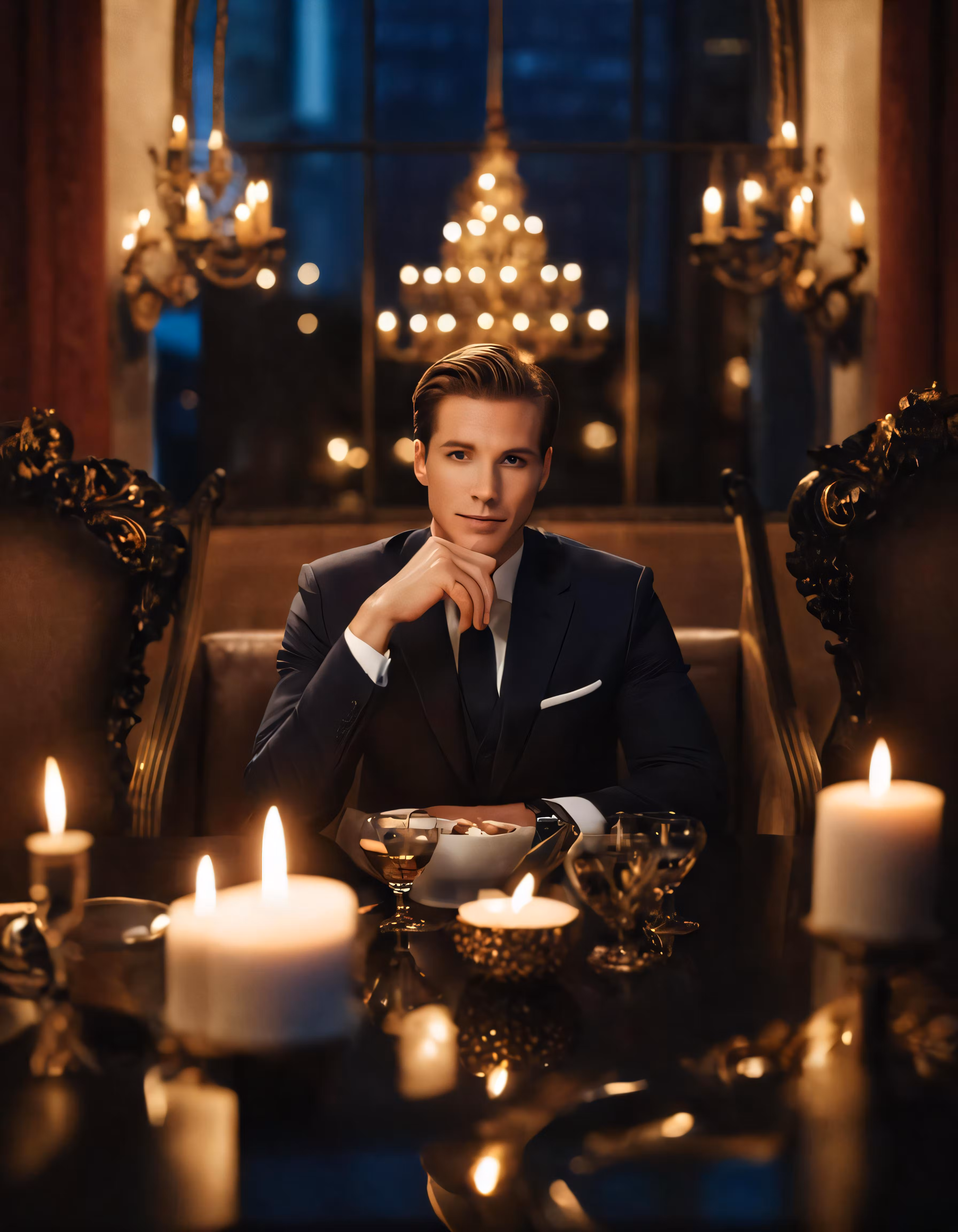 High resolution picture, free to use, man in a suite sitting at a table with two candles