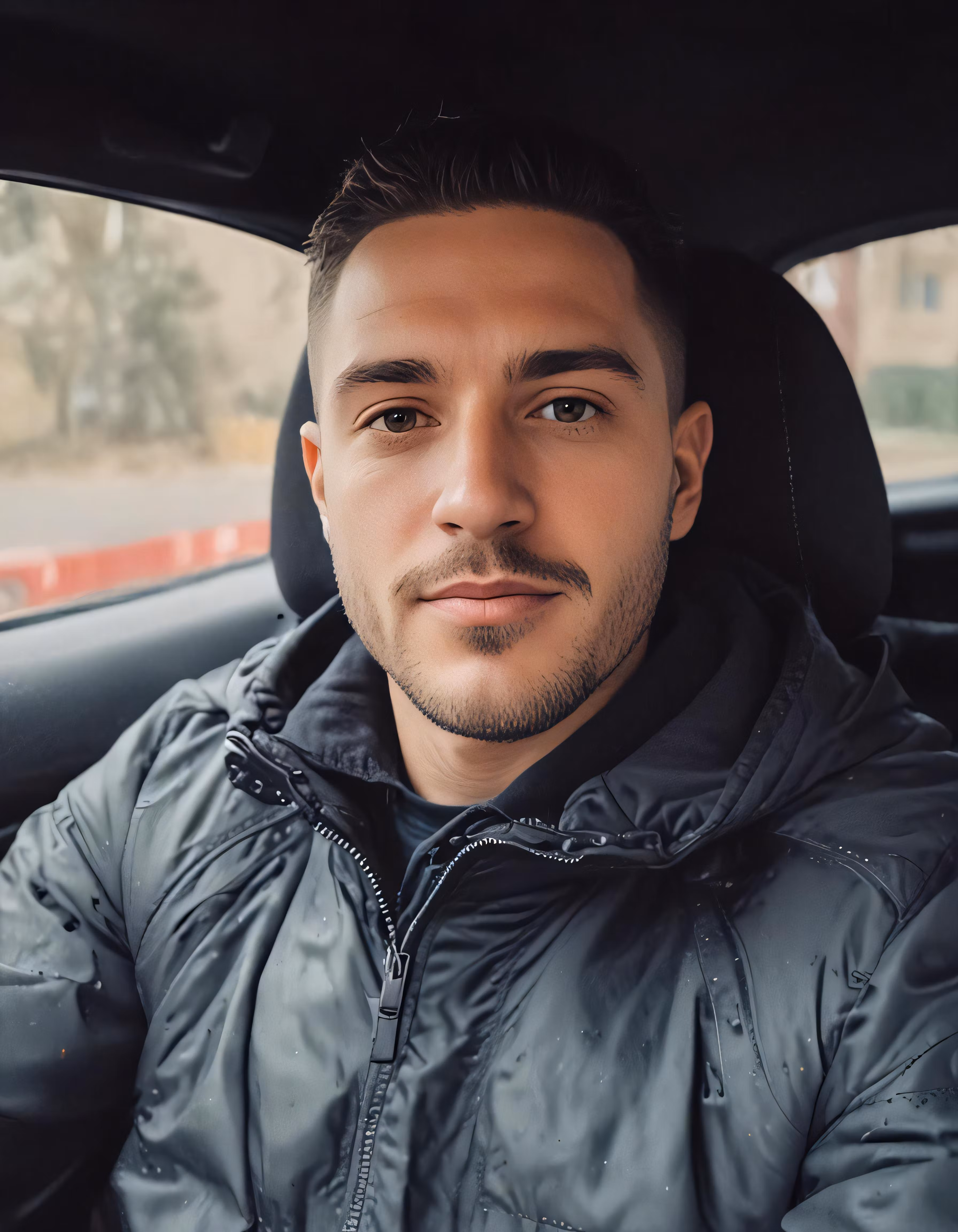 High resolution picture, free to use, man in car wearing winter jacket and looking into camera