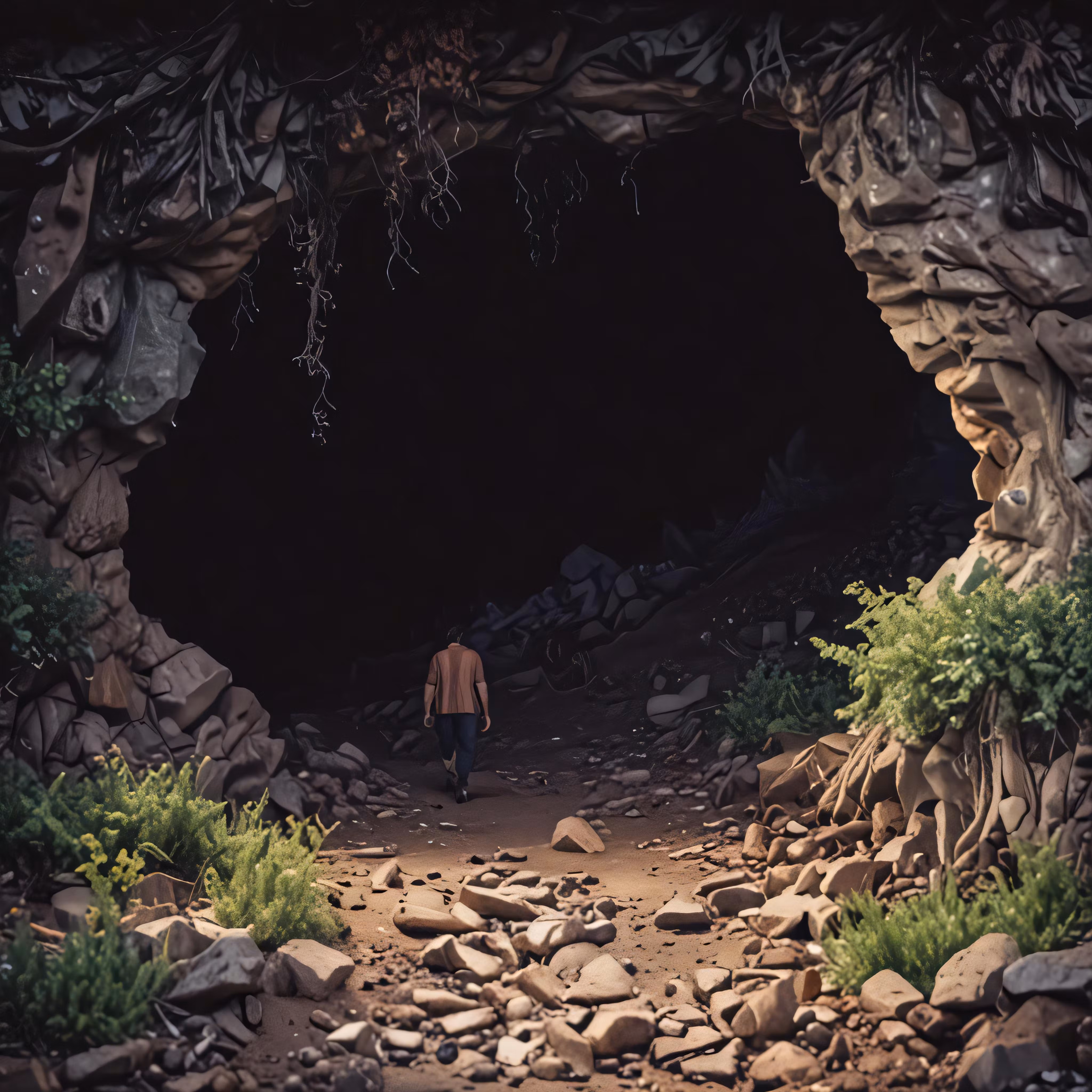 High resolution picture, free to use, man in front of entrance to a cave with rocks