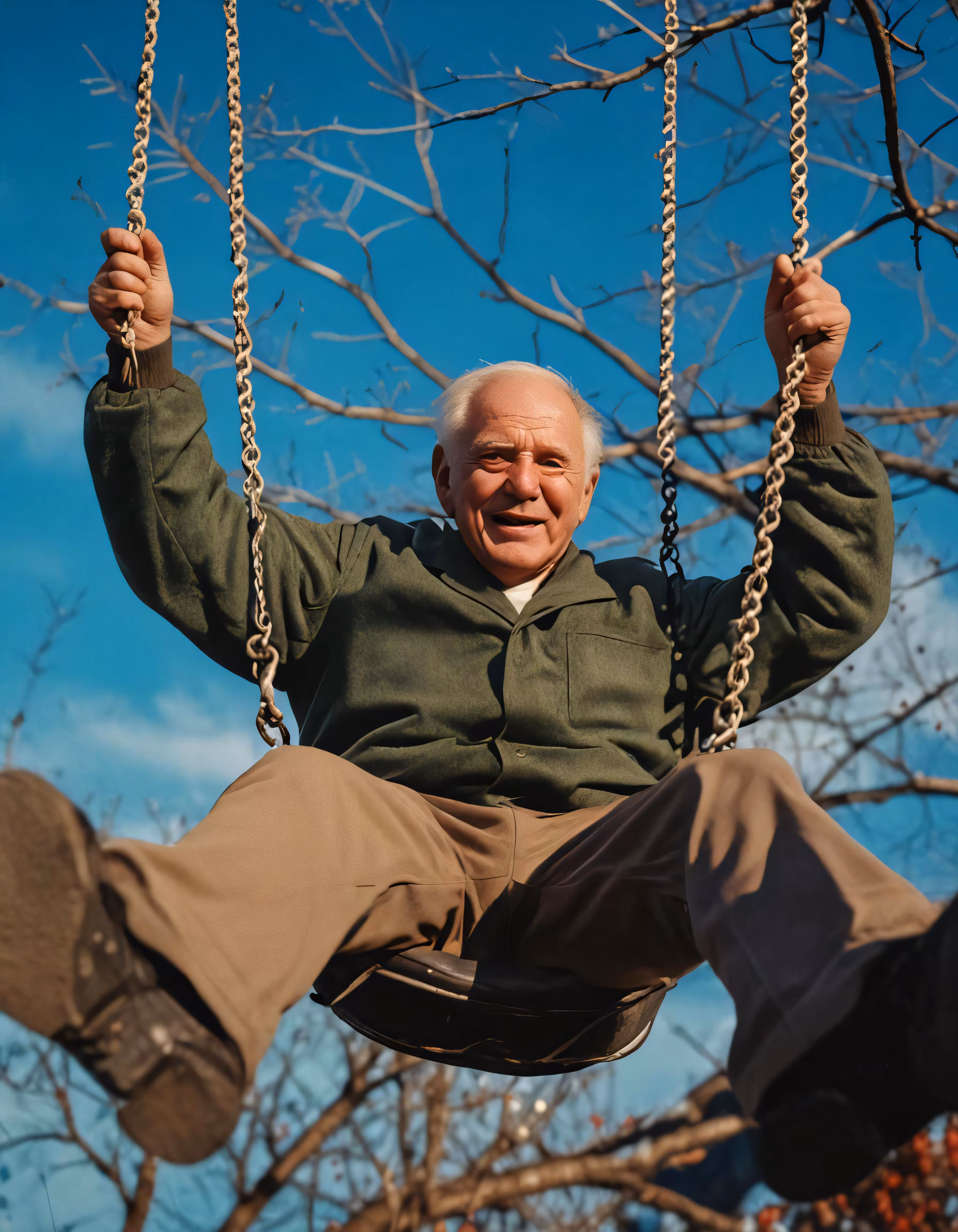 High resolution picture, free to use, man in green shirt swinging on a swing