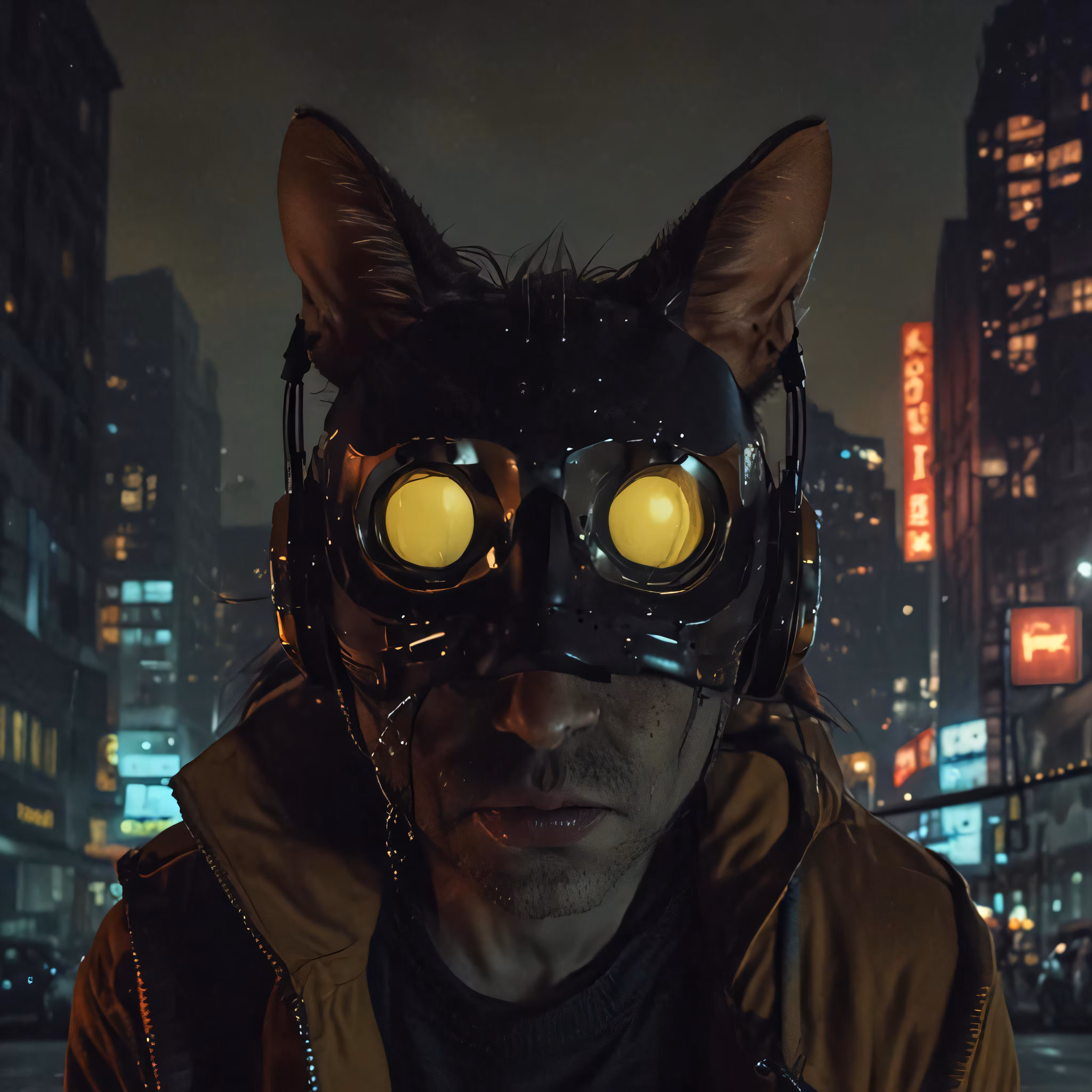 High resolution picture, free to use, man in late night city wearing goggles with yellow lights