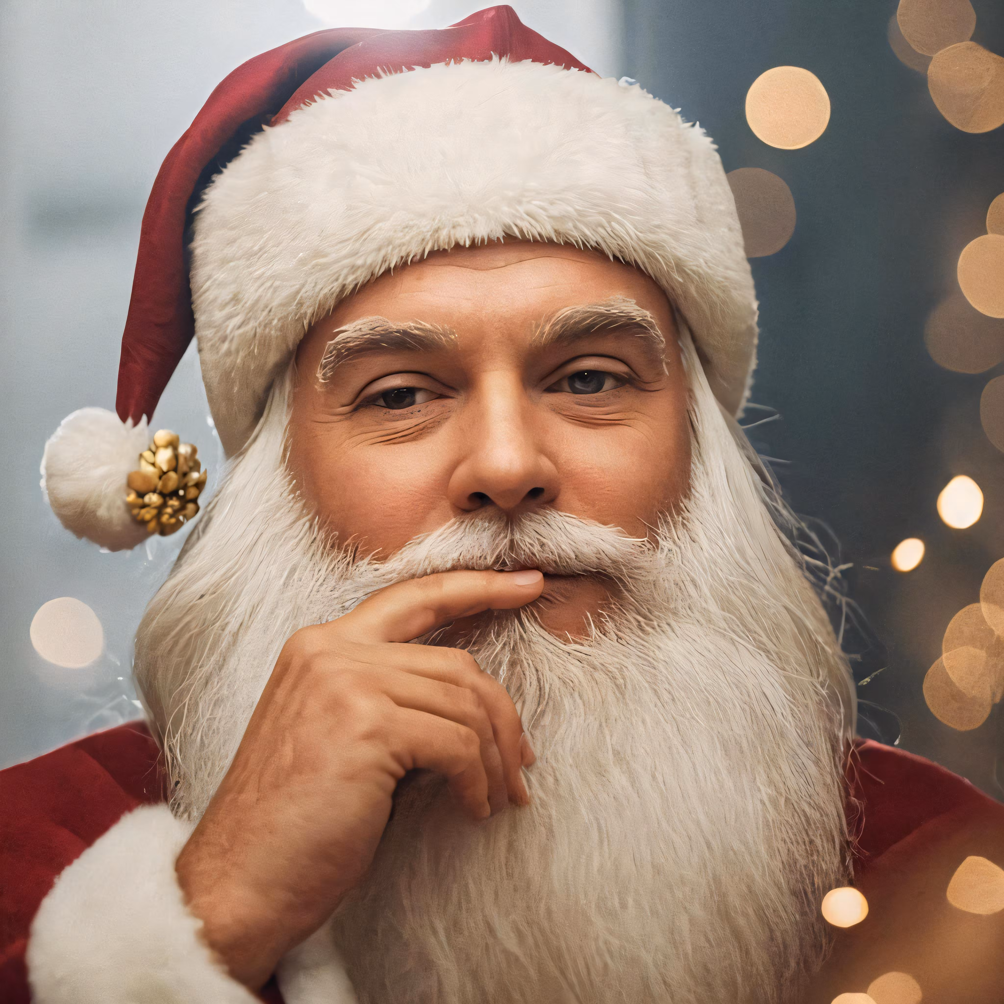High resolution picture, free to use, man in santa suit posing for camera with a bright boke of lights