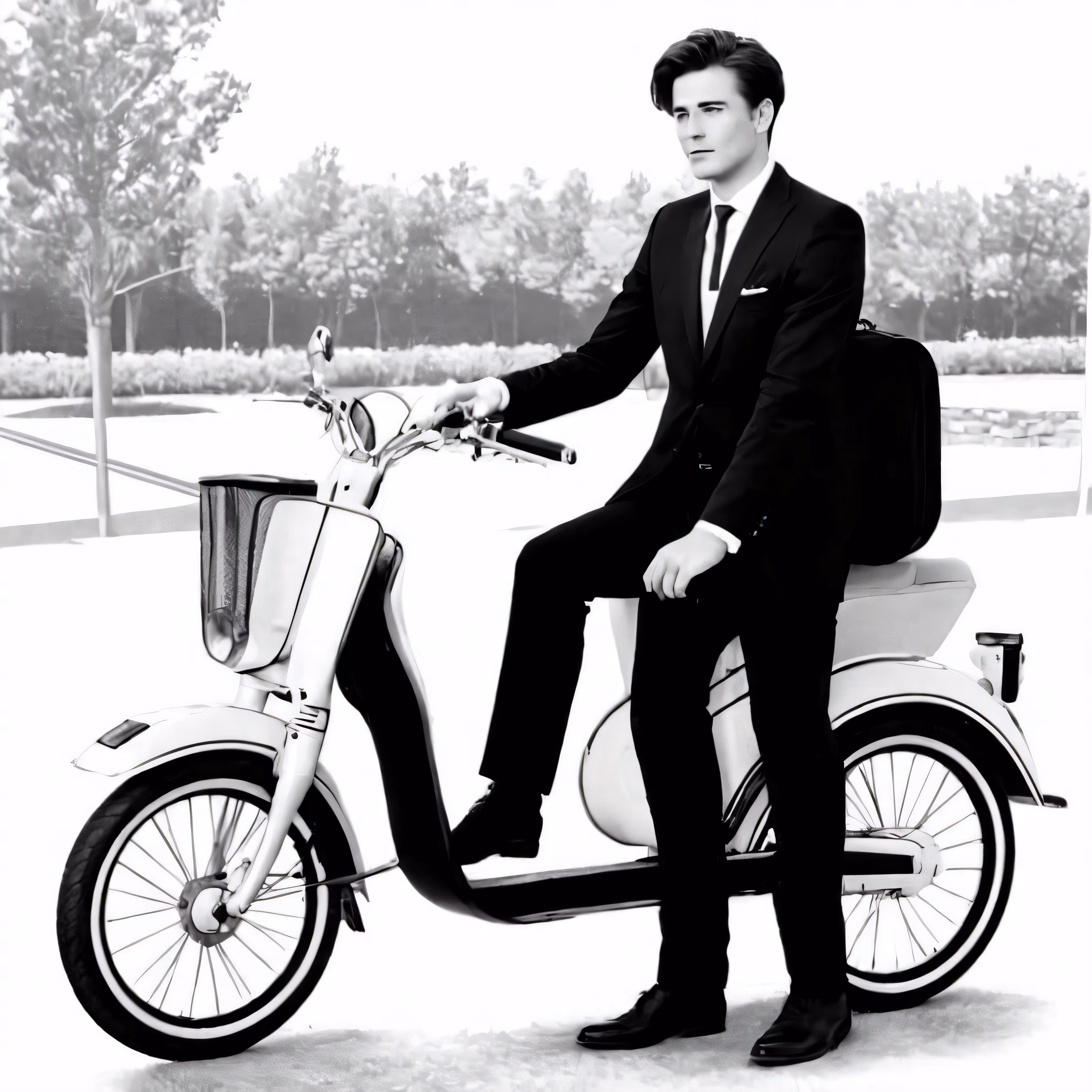 High resolution picture, free to use, man in suit sitting on an electric bicycle