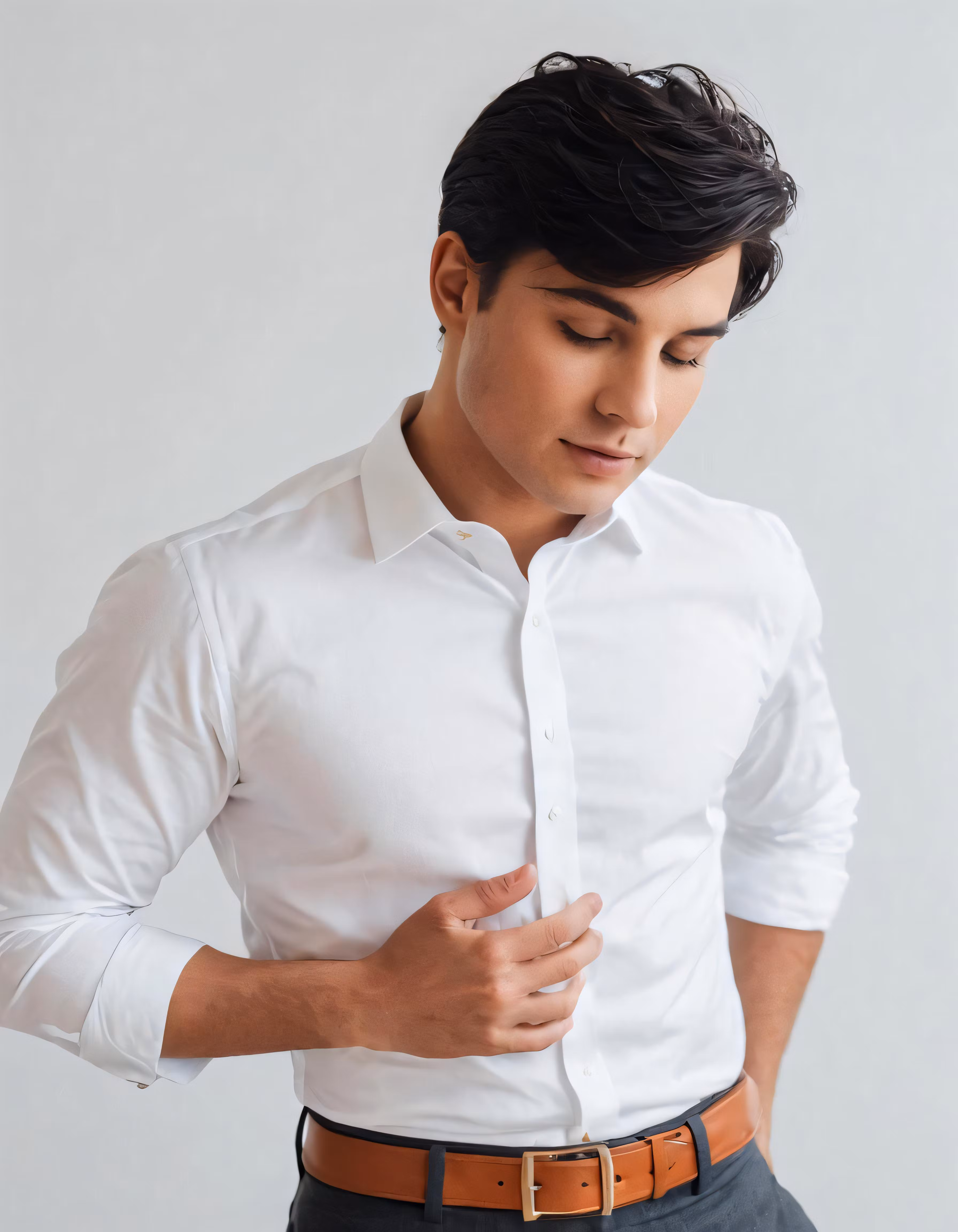 High resolution picture, free to use, man in white shirt looking down with hand on chest