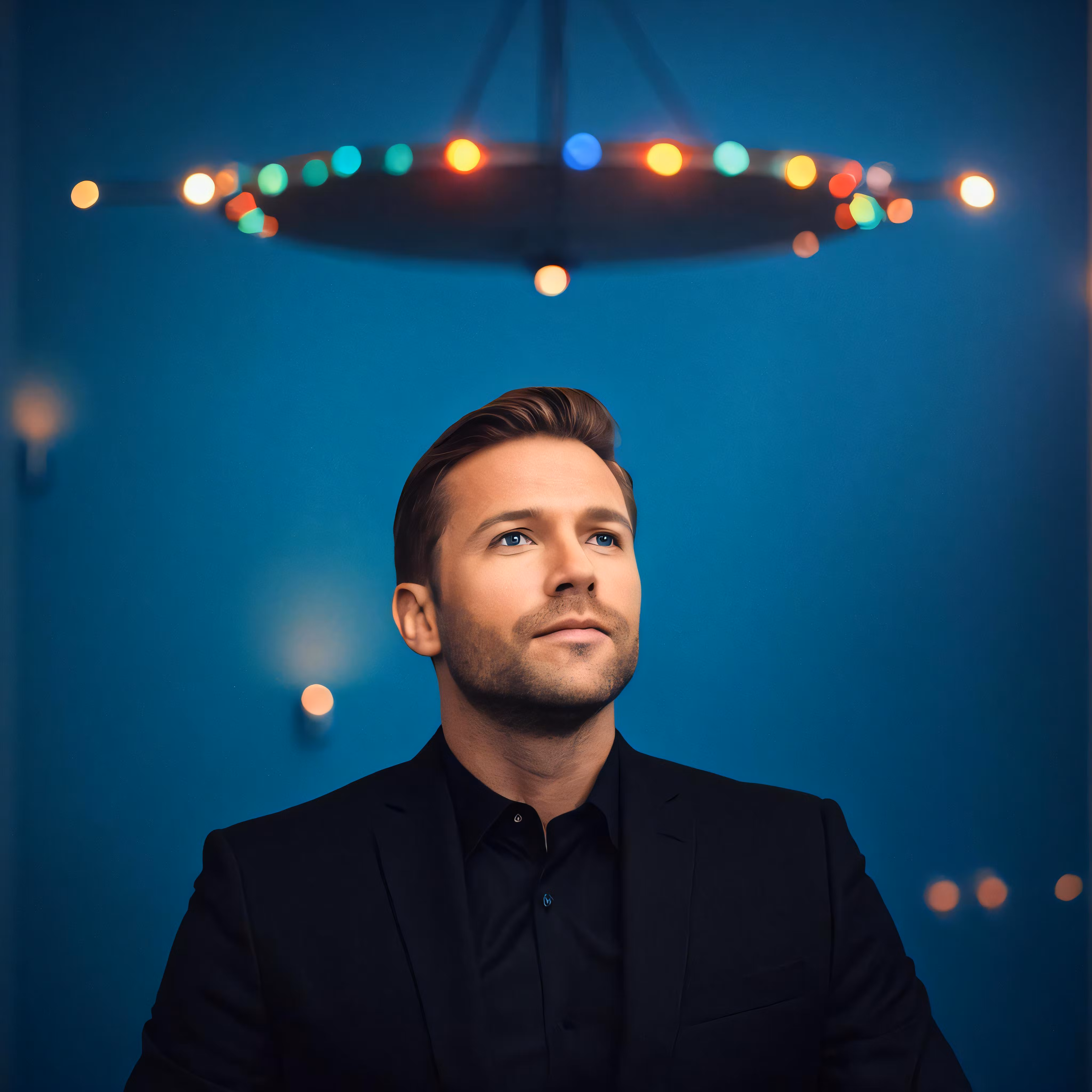 High resolution picture, free to use, man looking up into the air under a light filled area