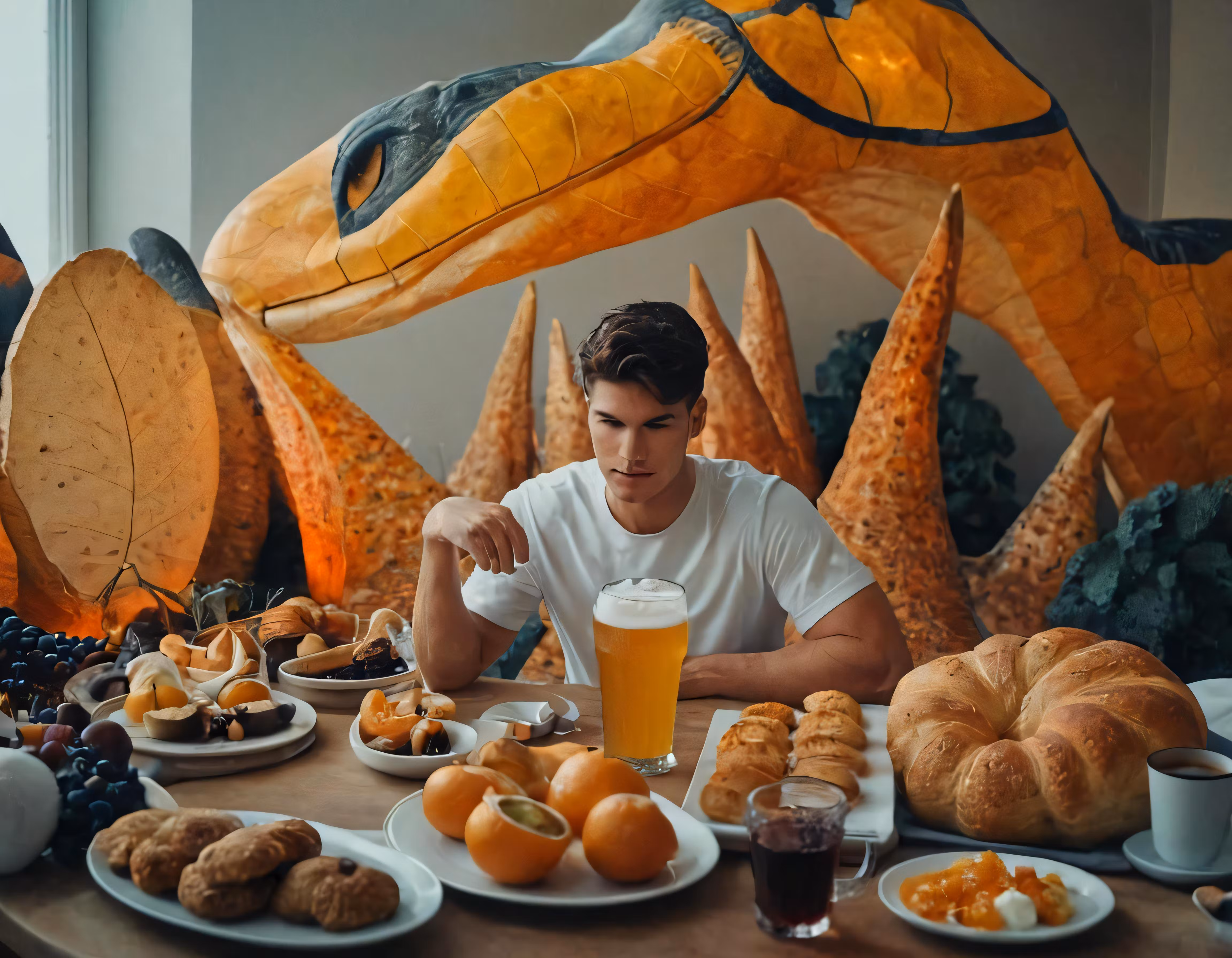 High resolution picture, free to use, man sitting at table filled with food, including oranges and fruit
