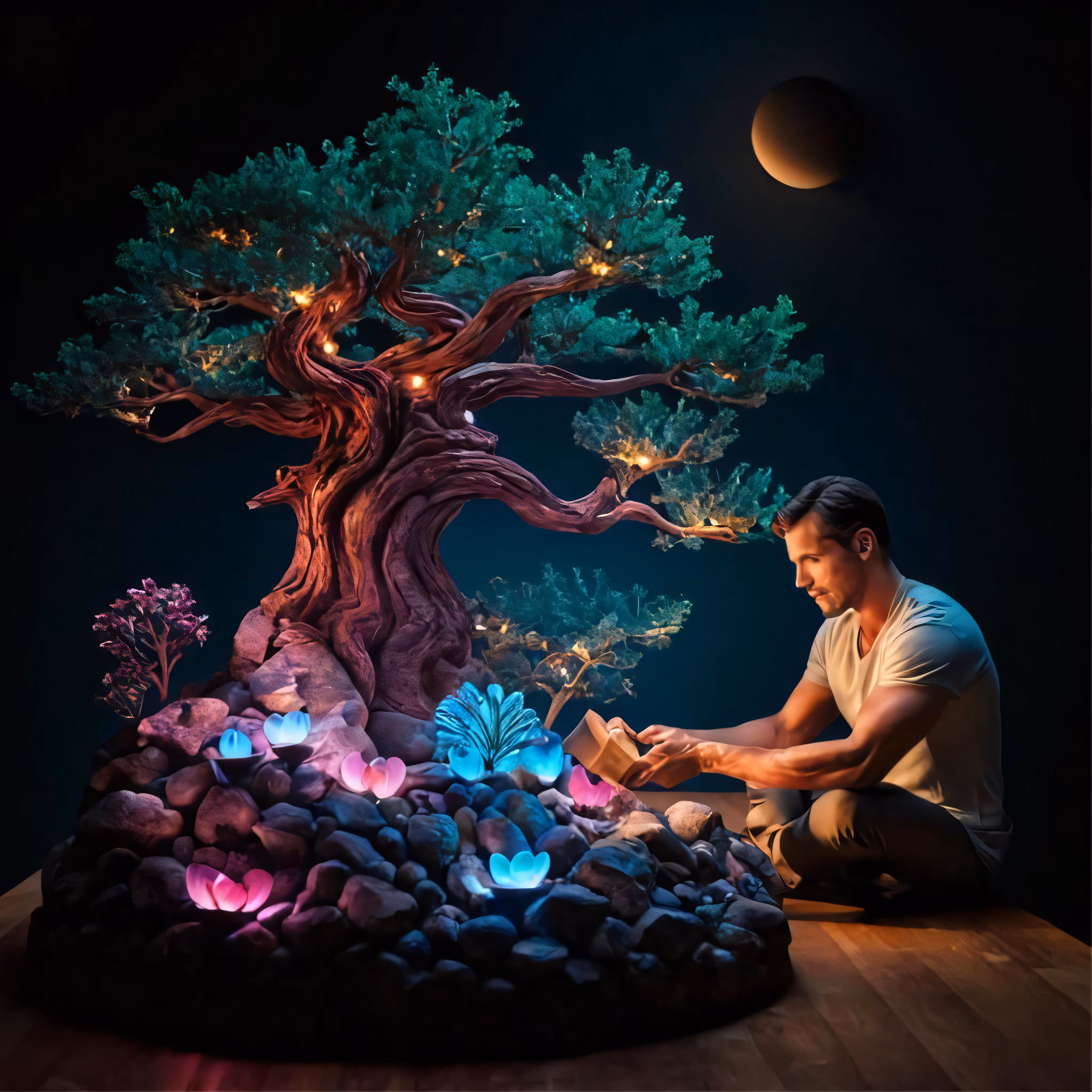 High resolution picture, free to use, man sitting in front of bonsai tree painting on canvas