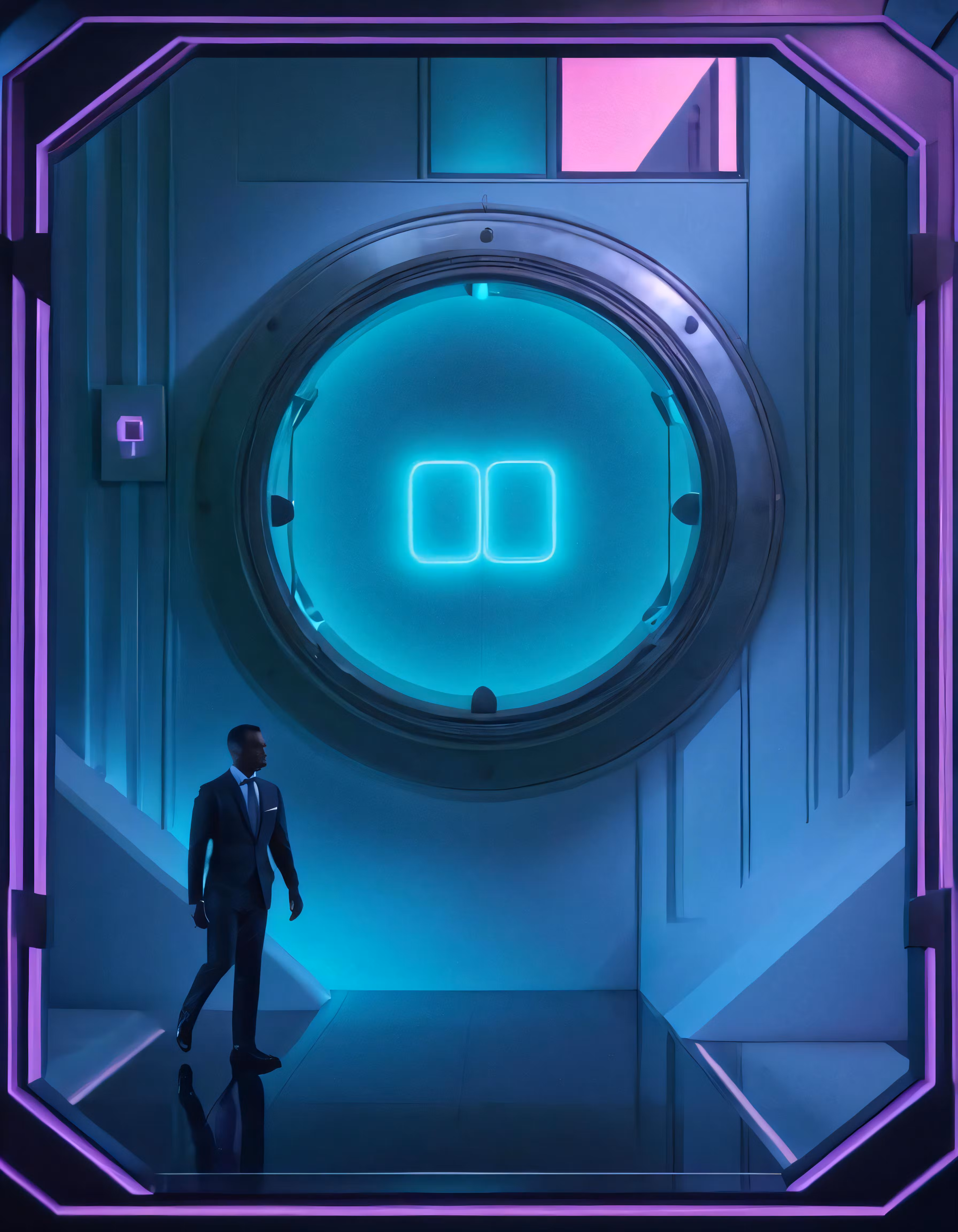 High resolution picture, free to use, man standing in front of an open circular window, standing inside an entrance to an unknown space